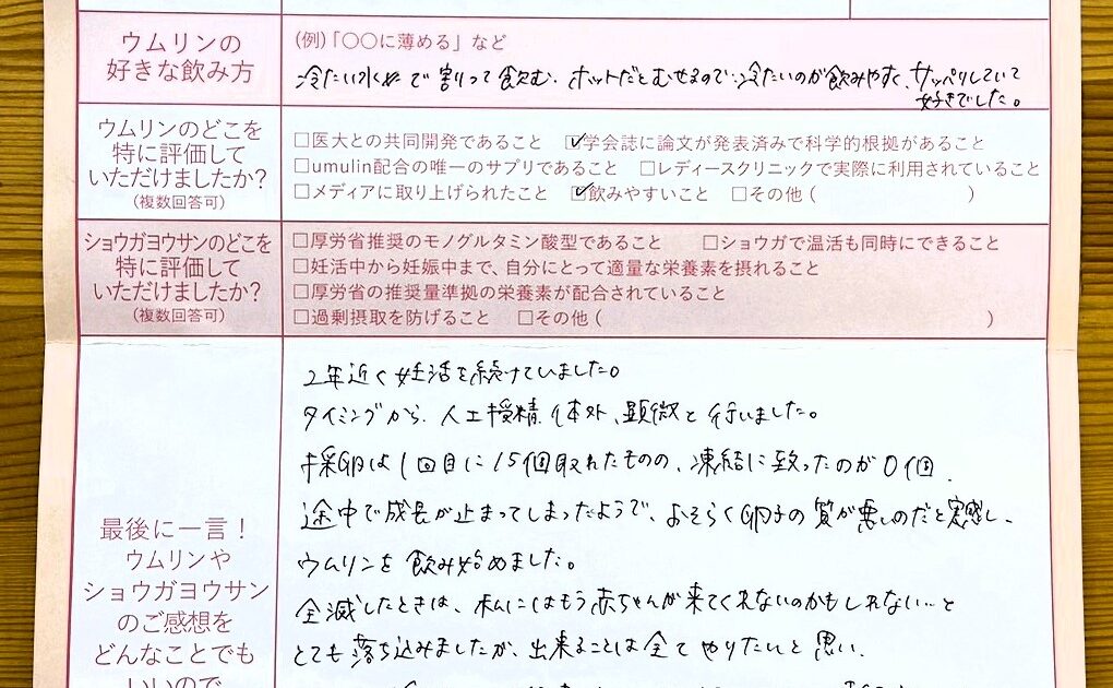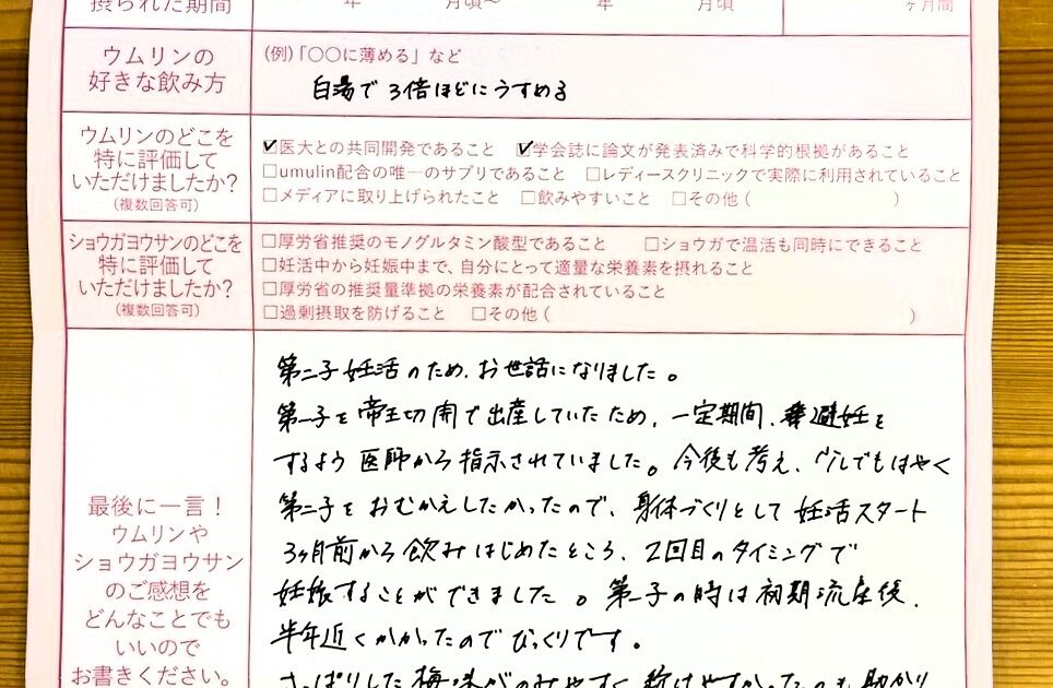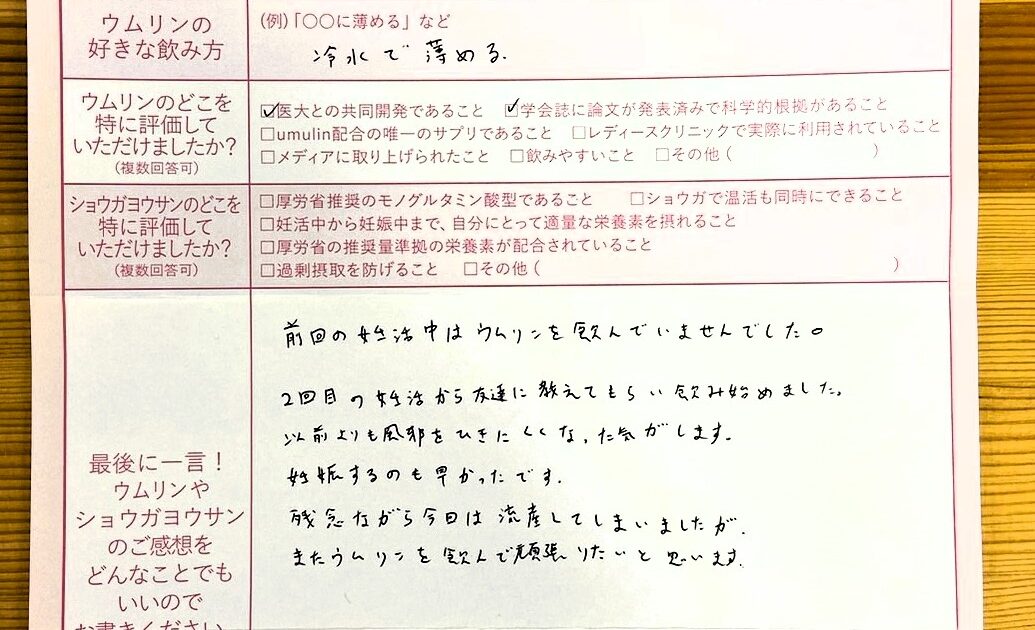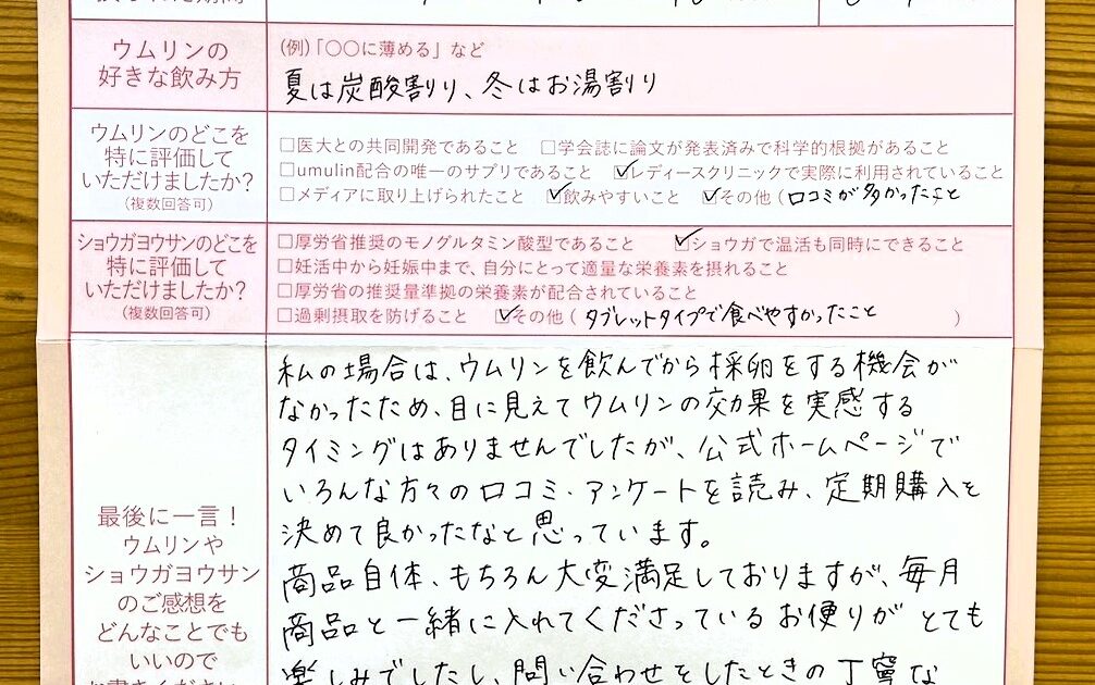 ウムリンを飲み始めました。本当にありがとうございます。皆にもオススメしたいです!!今からすごく楽しみです(^ー^)