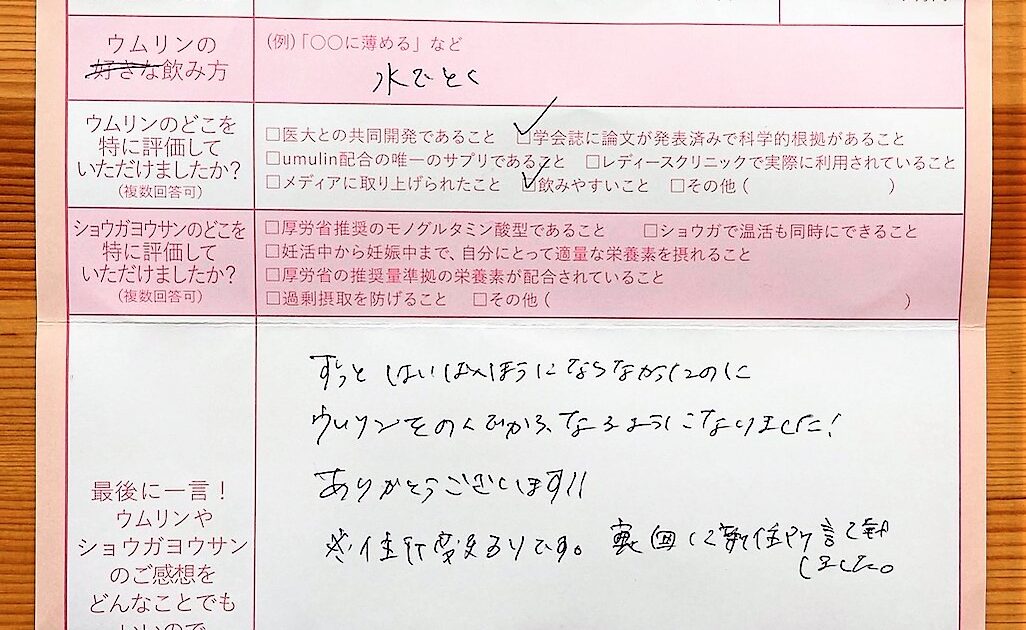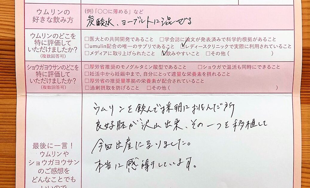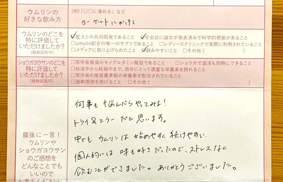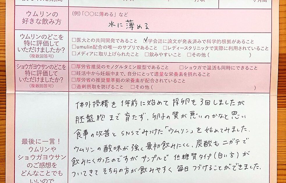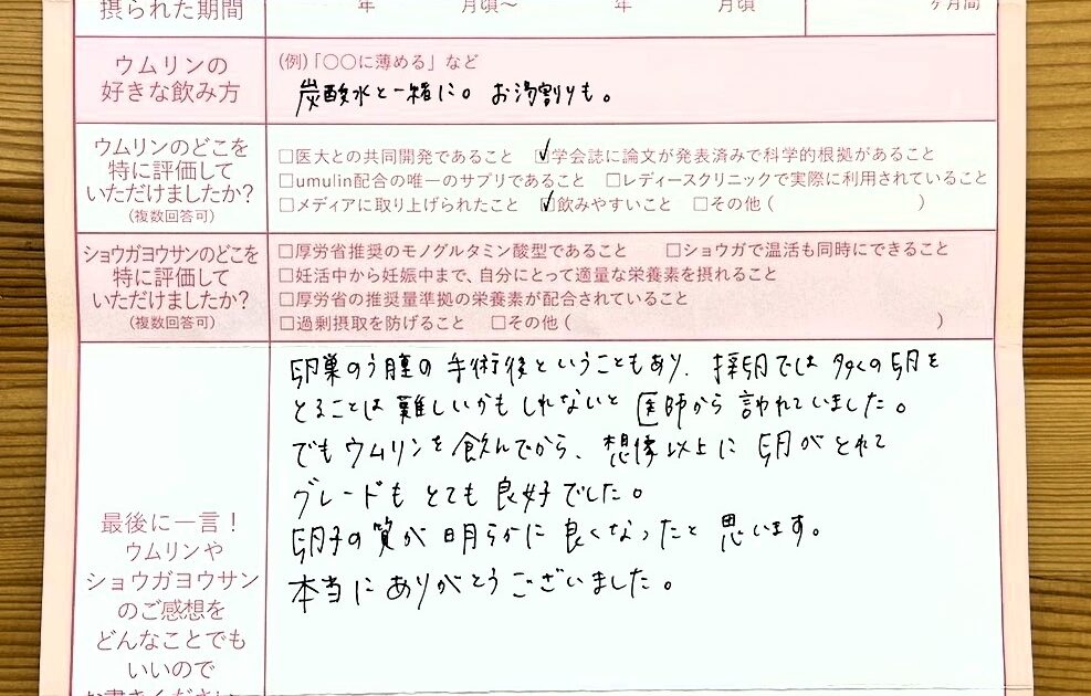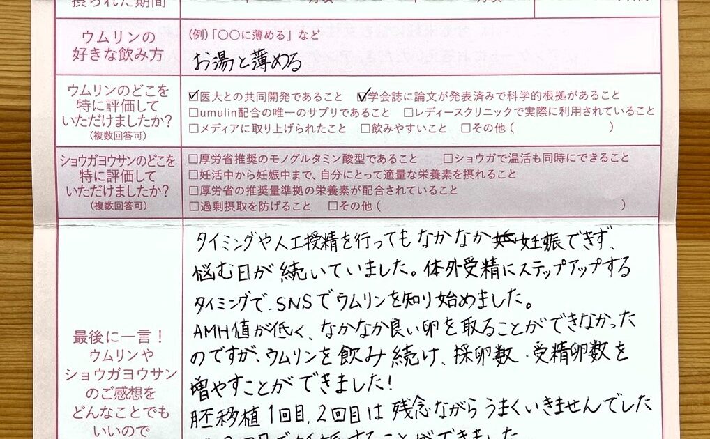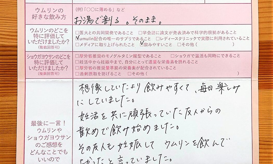 想像していたより飲みやすくて、毎日楽しみにしていました。妊活を共に頑張っていた友人からの勧めで飲み始めました。その友人もウムリンを飲んでよかったと言っていました。
