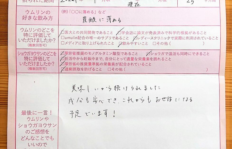 色々とネット情報などを見ていた時にウムリンを知ることができました。でも直に信じることが出来ず、約2か月ほどウムリンを始めるが悩んでいる時に、利用を始めました。本当にありがとうございました!