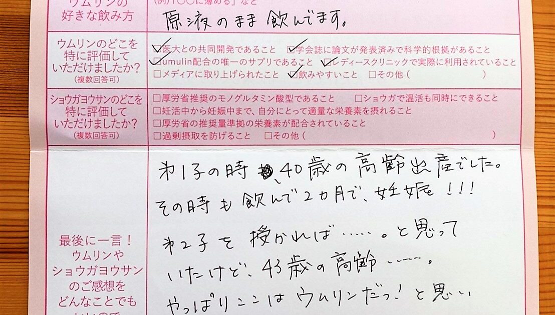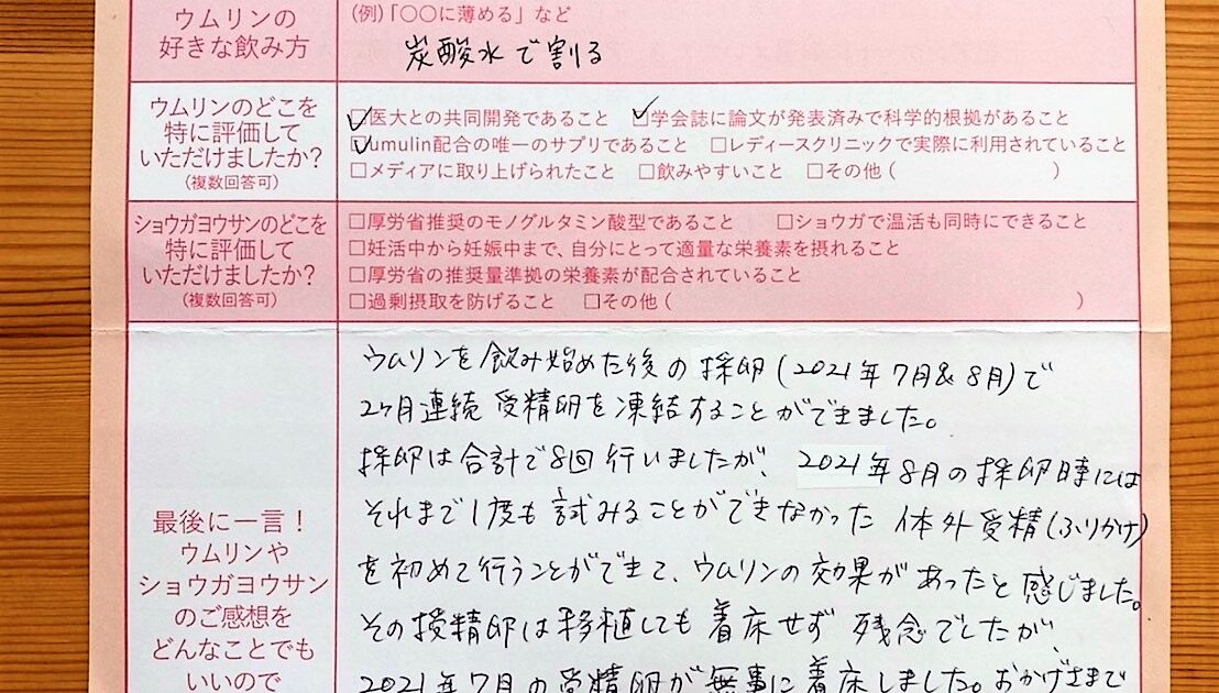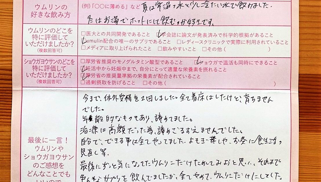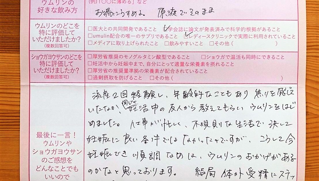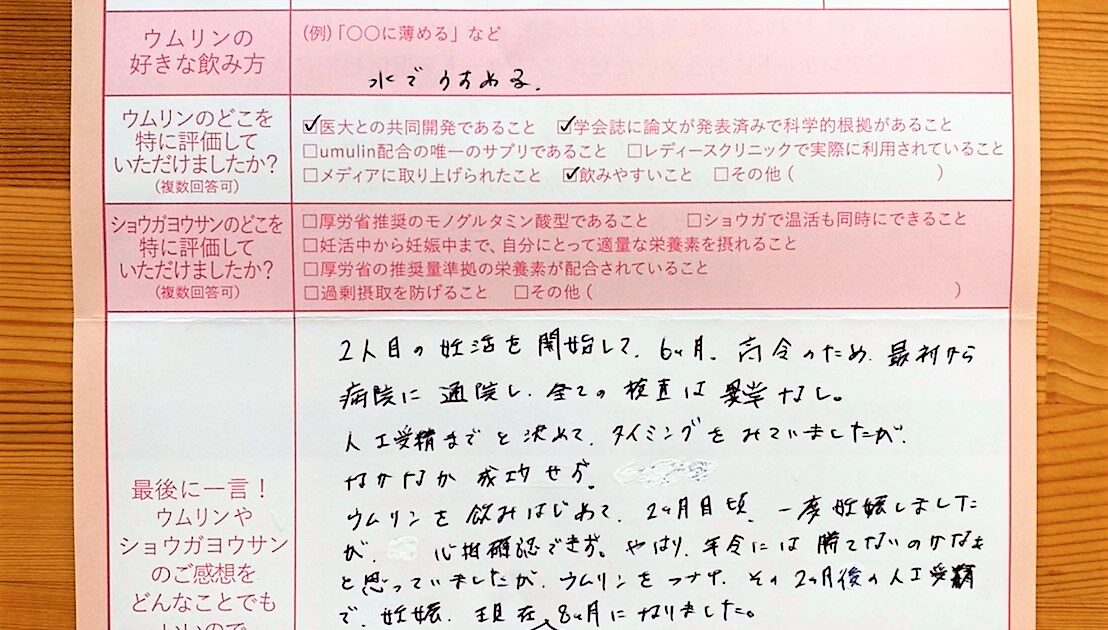 流産2回経験し、年齢的なこともあり焦りを感じていたなか、同じく妊活中の友人から教えてもらいウムリンをはじめました。仕事が忙しく、不規則な生活で決して妊娠に良い条件ではなかったのですが、こうして今順調なのは、ウムリンのおか […]