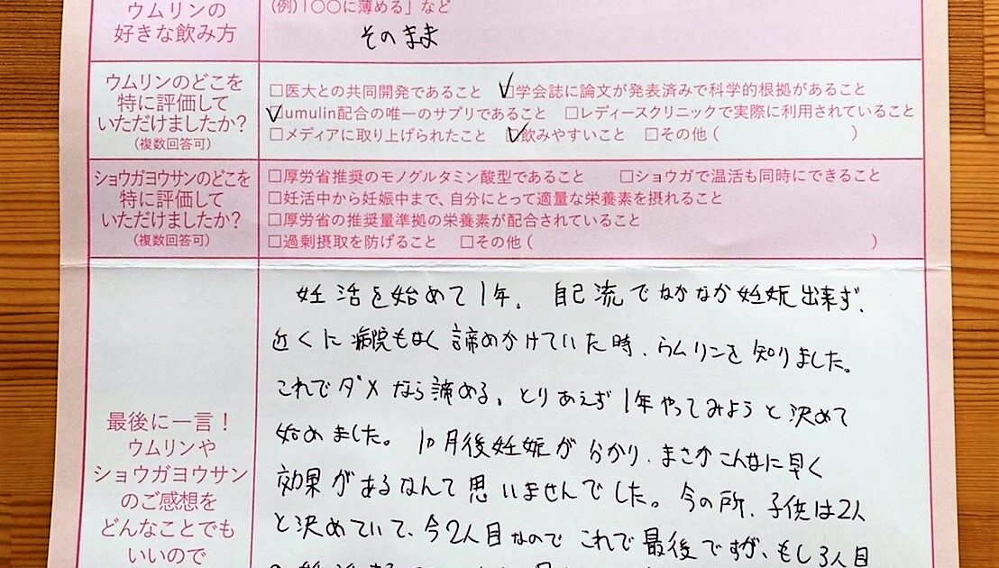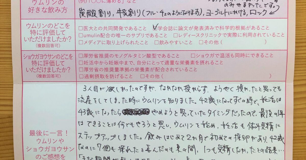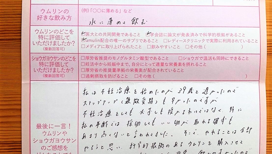 諦めかけていた時、ウムリンを知りました。これでダメなら諦める。とりあえず1年やってみようと決めて始めました。次は最初からウムリンをのみたいです。