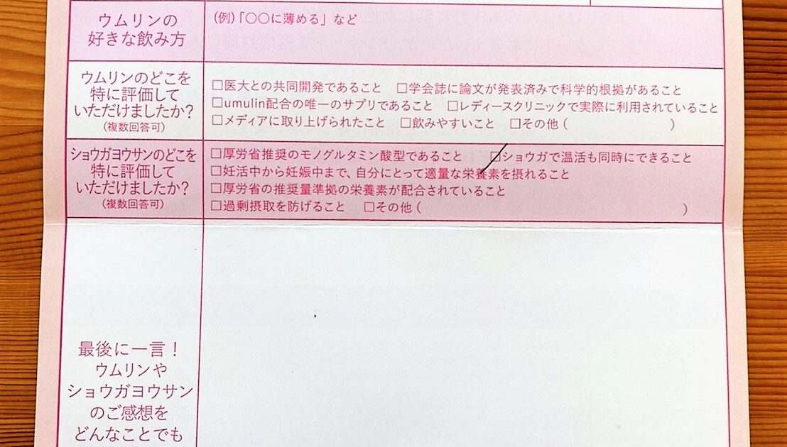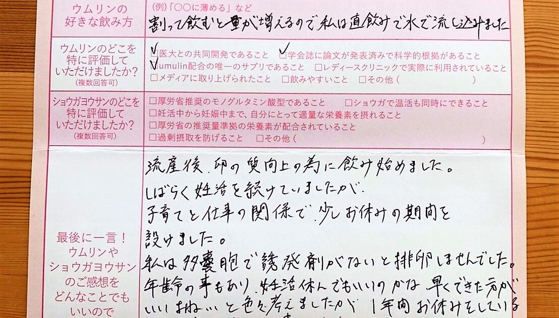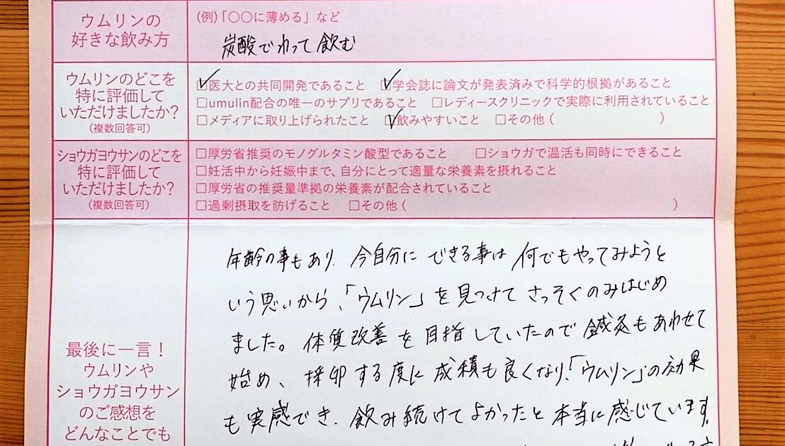 やれることは全部やろうと思い、ウムリンを購入させていただきました。試してみたら非常に飲みやすかったのでとても続けやすかったです。途中であきらめず、続けてよかったと思いました。本当にありがとうございました。