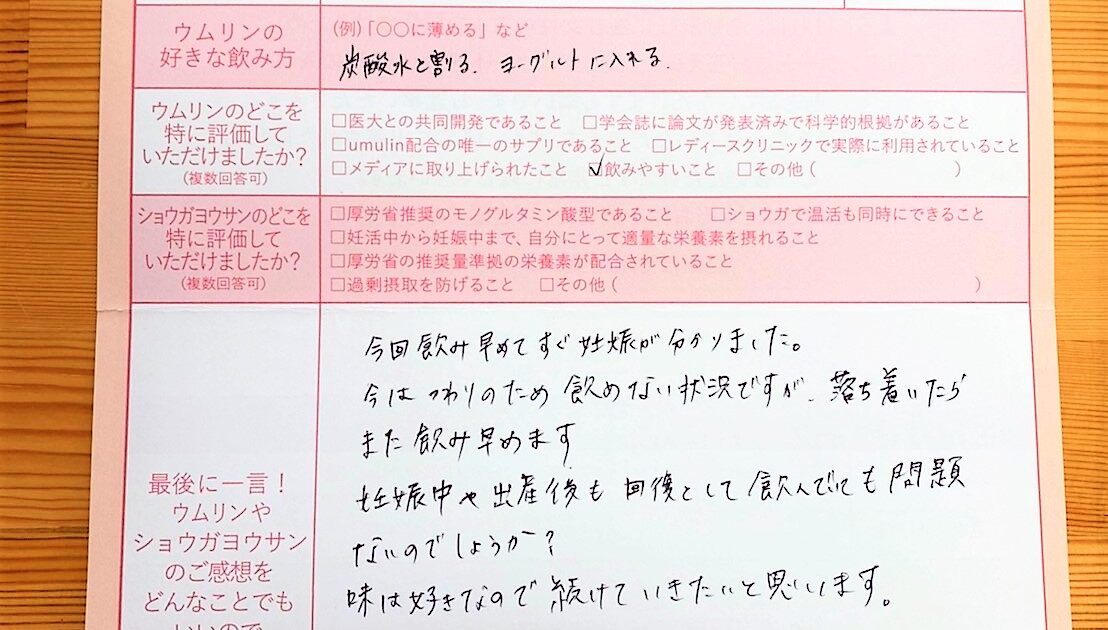 本当に感謝です。前期と後期でちがう栄養が入っているところが、かなりいいと思っています。つわり中は味がすこしのみにくいところが、少し改善してもらえたらうれしいところです。ウムリンも飲みにくかったです。ショウがヨウサンはその […]