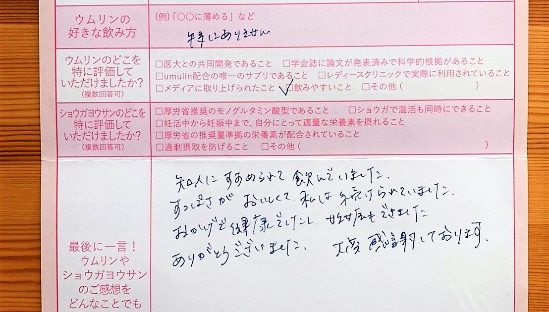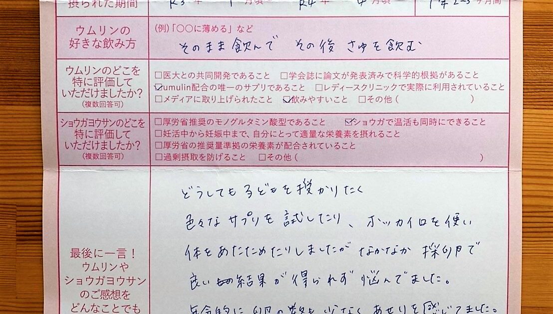 年齢的にも、何でも試してみようと思い、ウムリンを飲み始めました!まだ不安がありますが、感謝です。ウムリンを飲んで良かったです。ありがとうございます。