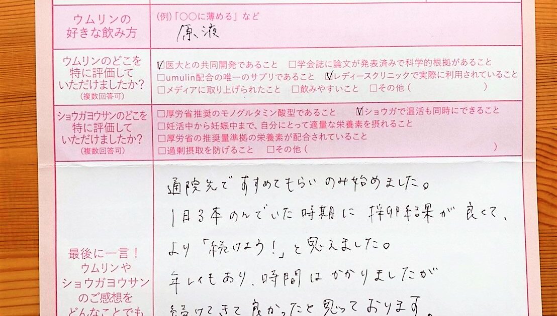 年令的にあせりを感じてました。 違う所からのアプローチを考えていた所ウムリンに出会いました。すがる気持ちで毎日2回(忘れる日も多々有り)飲みました。本当にありがたいの一言です!!