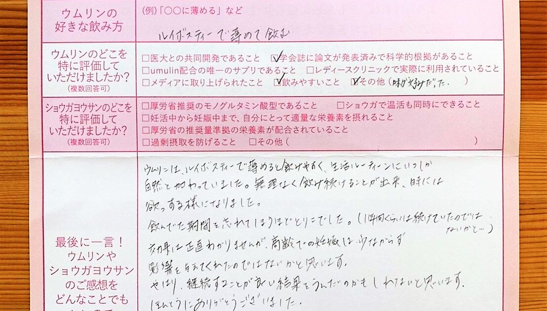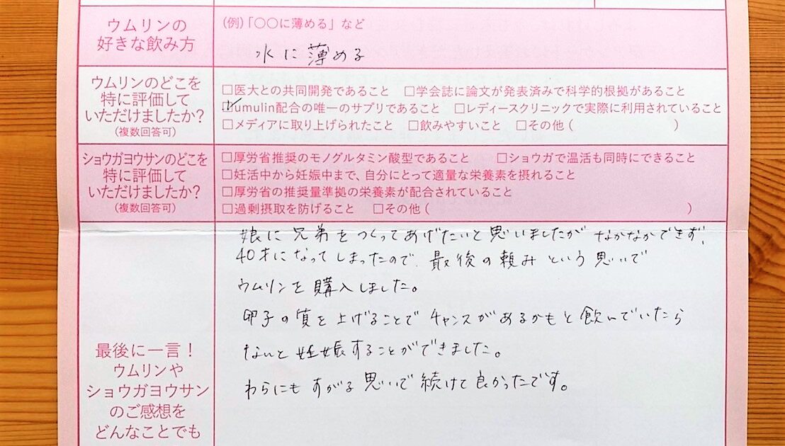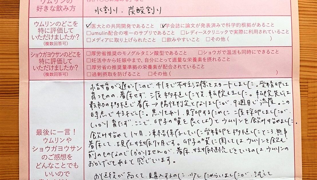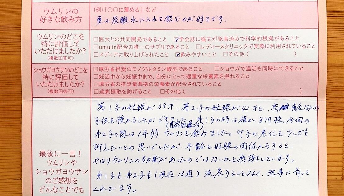 結婚が遅かったので、41才でスタートしました。ウムリンを飲み始めました。お値段が高くて、購入するのに少しためらいましたが、良かったと思います。ありがとうございました。