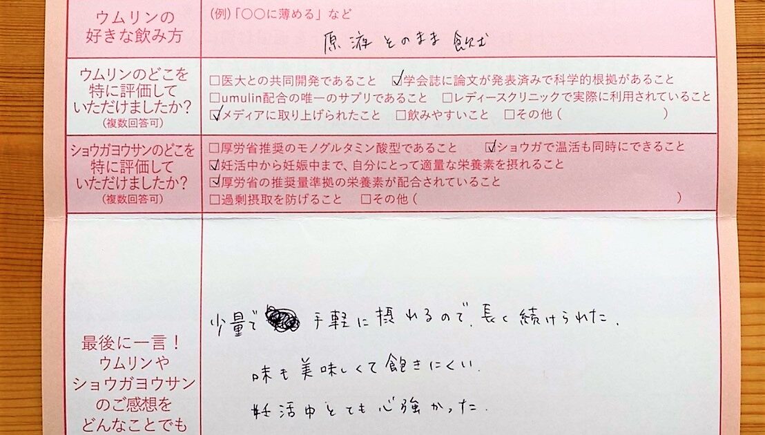 はじめまして。ウムリンを知り、すぐ定期購入をスタート。毎日欠かさず飲んでいました。食事にも気をつけながらプラスウムリンを飲用。感謝しています。ありがとうございました。