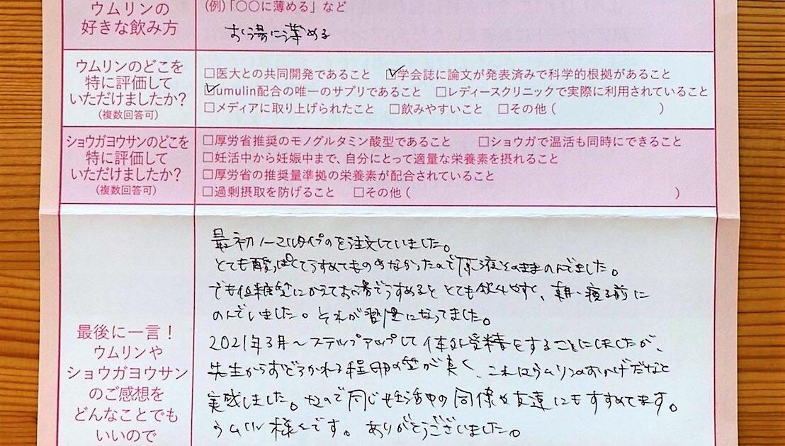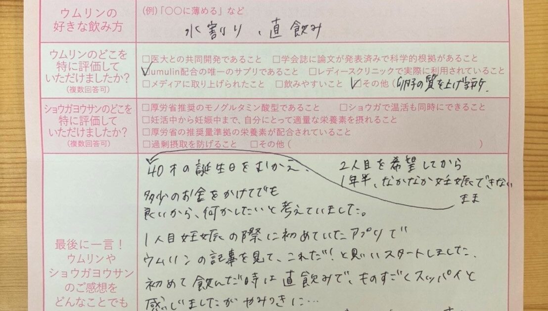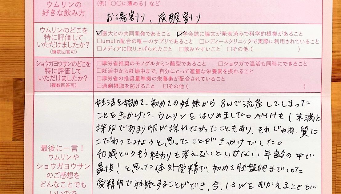 1人目を出産して3年後に稽留流産を経験しました。それから3年が経ち今年で40歳になるということも考え、でも不妊治療するほど仕事の調整も難しいと思い、SNSで調べて”ウムリン”を知りました。これを飲 […]