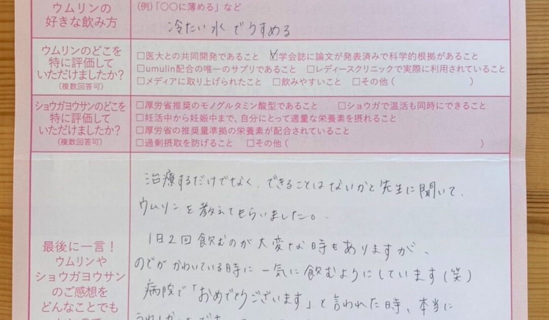 治療するだけでなく、できることはないかと先生に聞いて、ウムリンを教えてもらいました。1日2回飲むのが大変な時もありますが、のどがかわいている時に一気に飲むようにしています(笑)病院で「おめでとうございます」と言われた時、 […]
