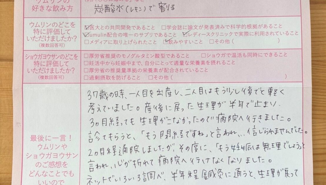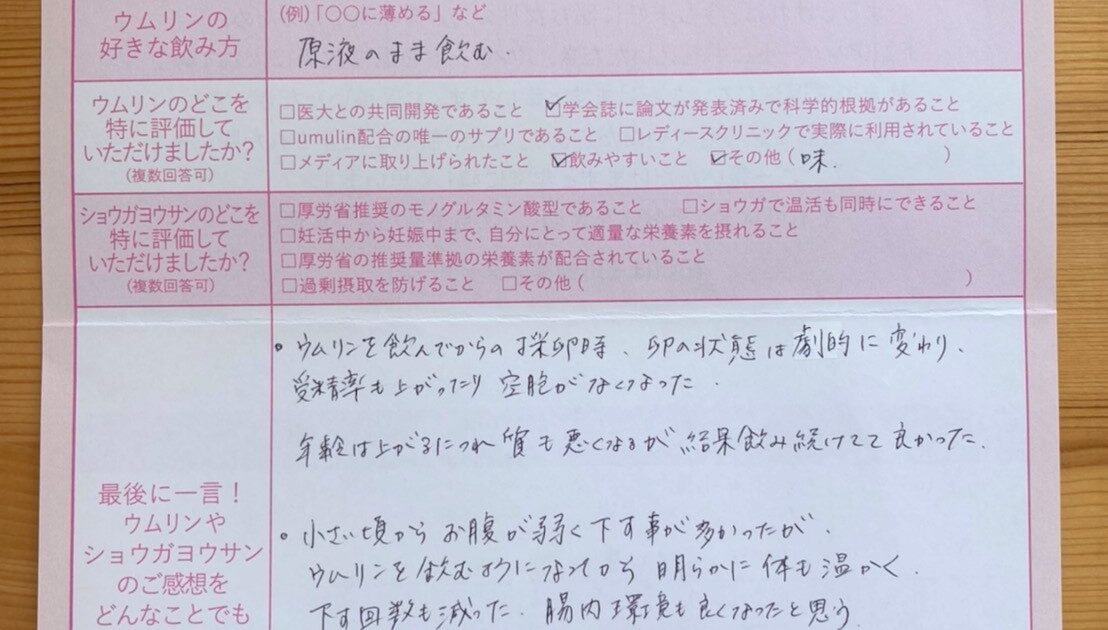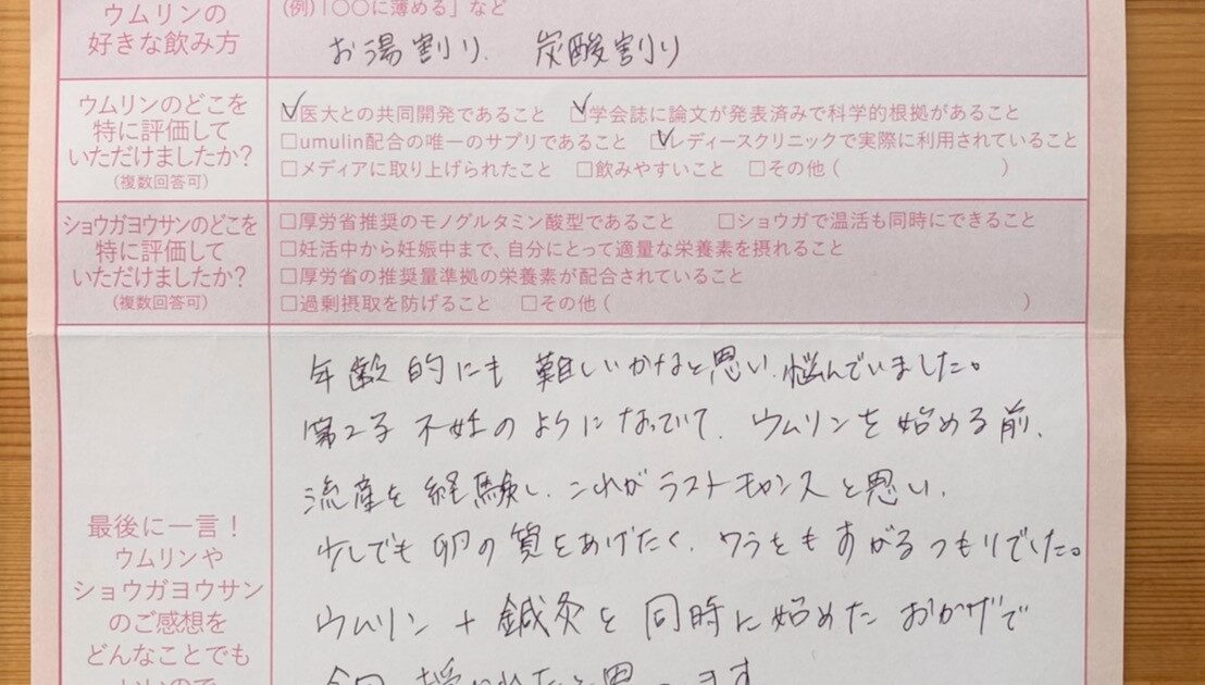 39才で結婚。色々情報収集中にウムリンを知り、飲み始めました。ショウガヨウサンも飲み始め、通院も一旦ストップし食生活の見直しと筋トレを始めました。 まだまだ安定期までは長いし高齢なので安心はできませんが、本当にうれしいで […]