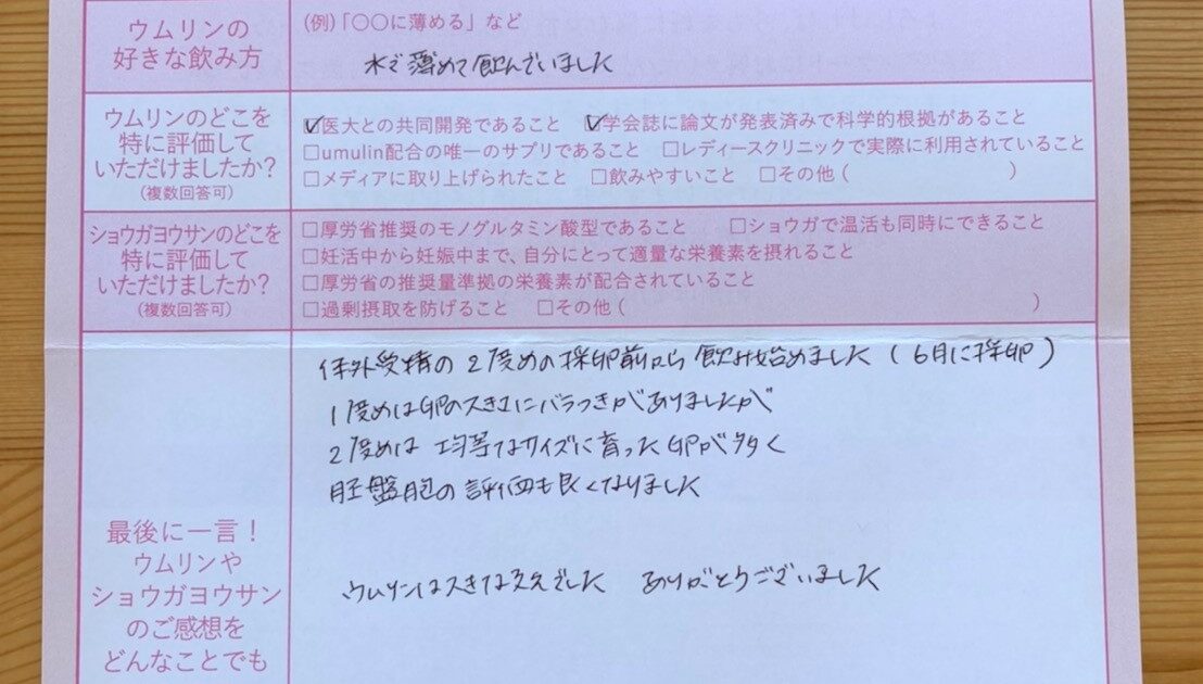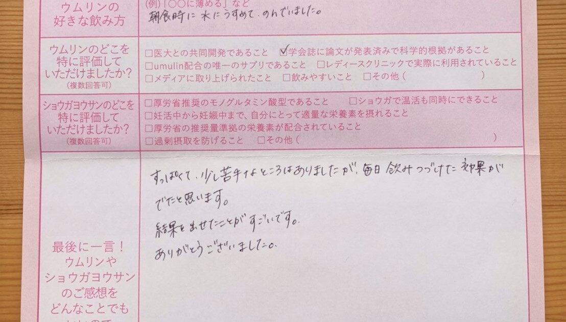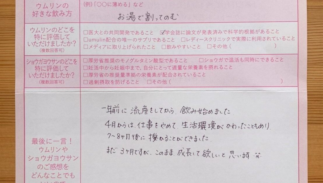 ウムリン・ショウガヨウサンを飲み始めてから、結果がとても良くなりました。まだまだ安定期まで不安もありますが、信じて頑張りたいと思います。本当にありがとうございました。