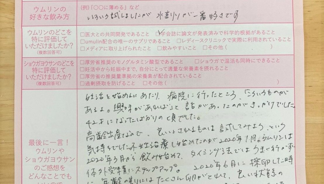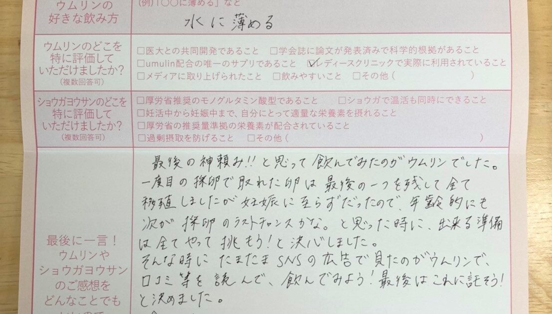 良いとされるものは試してみよう、という気持ちでした。こんなに順調に行くとは思わず、驚きでした。今も、毎日飲み続けています。ウムリンのおかげで体の調子が保たれていると思います。ありがとうございました!