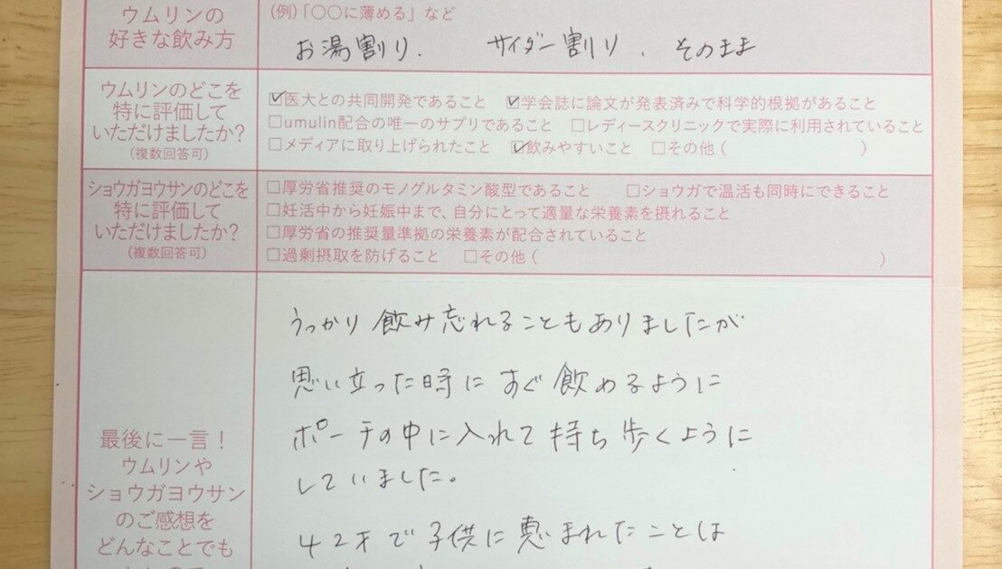 2020年~1年ほどウムリンとショウガヨウサンを使用していました。 梅味が飲みやすく、ストレスなく続けられました。 サプリと一緒に届くお便りも明るくて良かったです。 ありがとうございました。