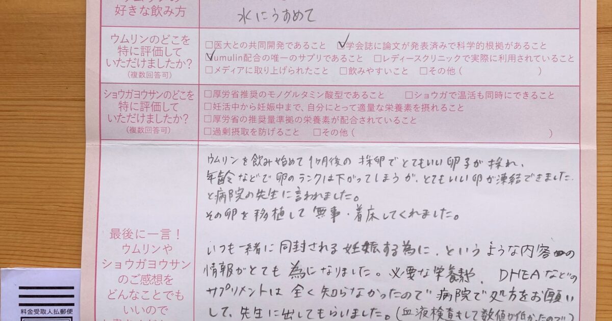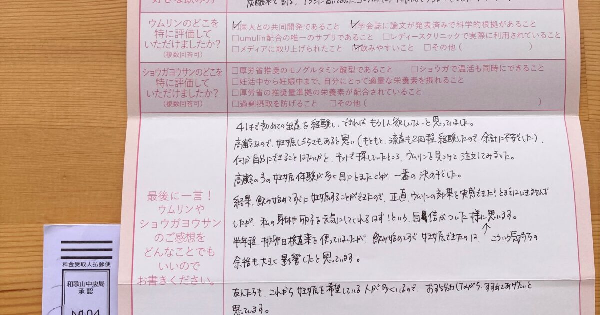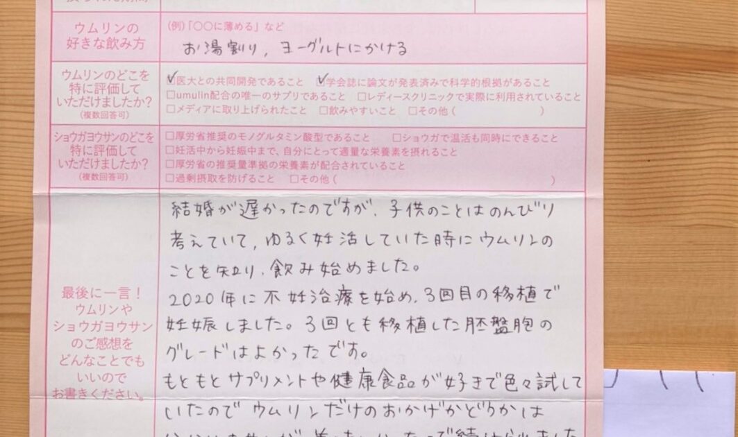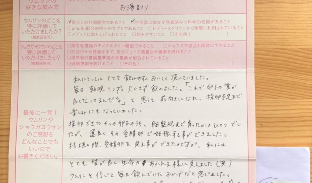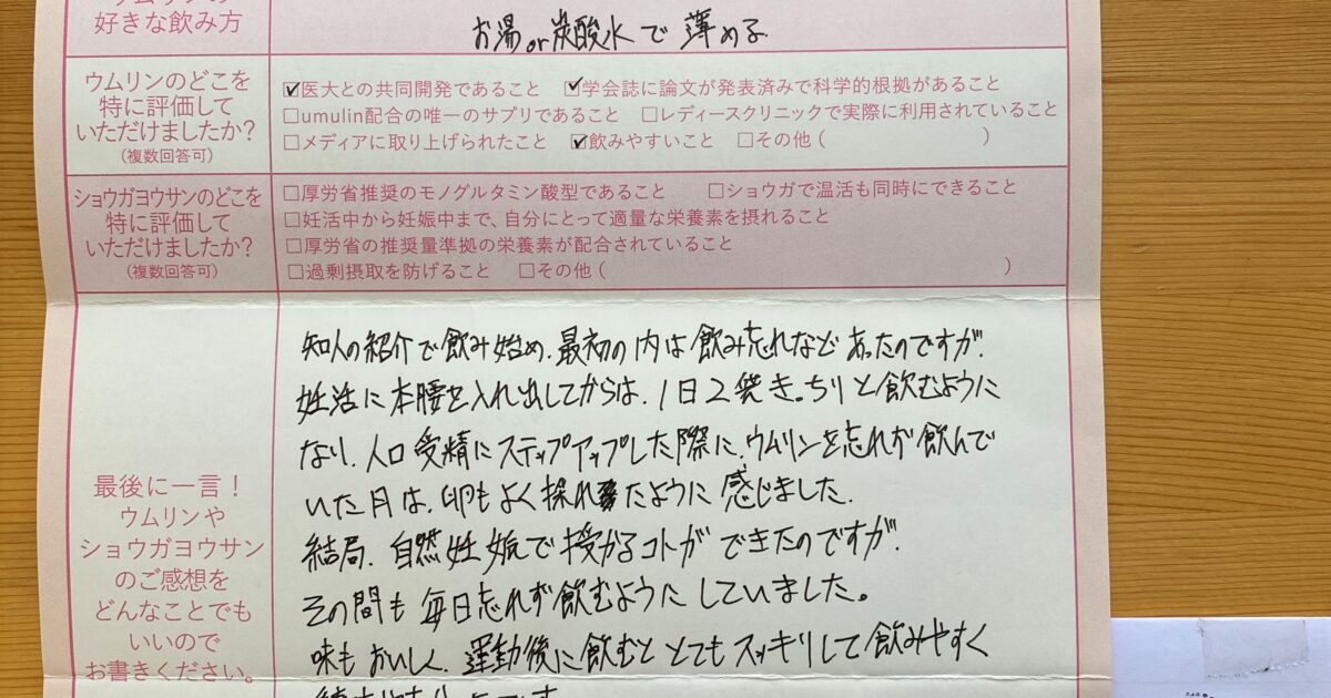 私にとってはとても飲みやすくおいしく頂いていました。 毎日朝晩1つずつ欠かさず飲みました。 ウムリンを信じて毎日飲んでいたおかげだと感じました。 本当にありがとうございます!出産までまだまだなので安心はできませんが自分と […]