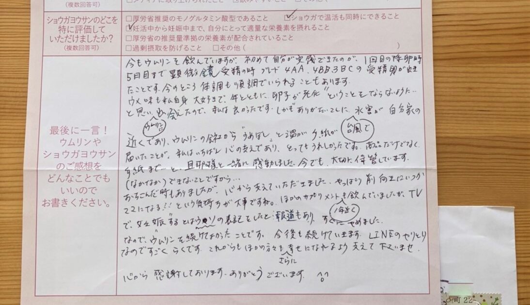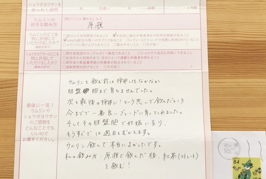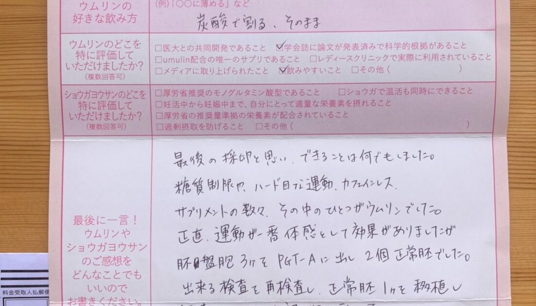 一人目出産後、2人目を考えた時からの飲みはじめました。 双子のためなかなか大変な妊娠生活ですが、2人目を諦めずにずっとウムリンを飲んでいてよかったです。ありがとうございました。