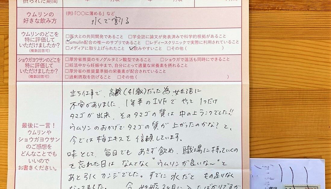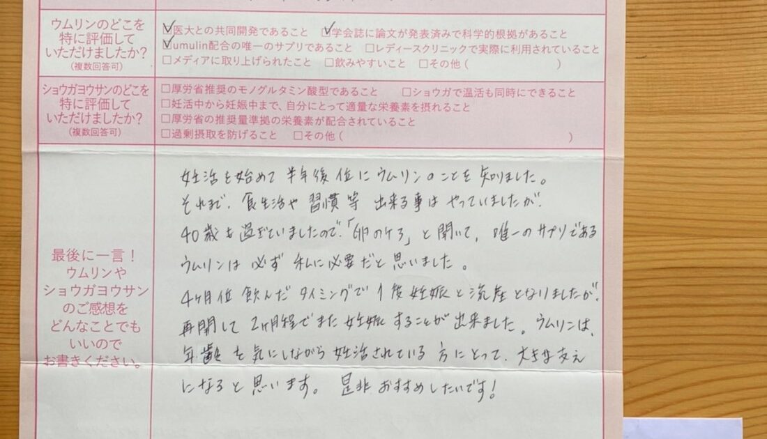 半年後位にウムリンのことを知りました。ウムリンは、年齢を気にしながら妊活されている方にとって、大きな支えになると思います。是非おすすめしたいです!ありがとうございました。