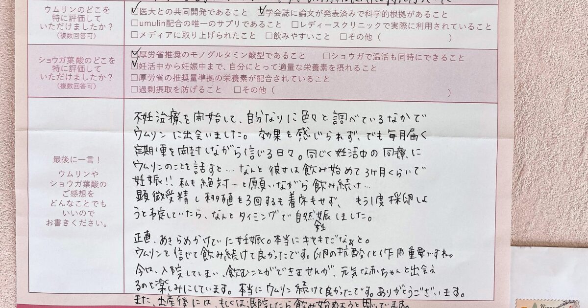 不妊治療を開始して、顕微授精し移植を3回するもできず、もう1度採卵しようと予定していたら、なんとタイミングで自然にできました。正直、あきらめかけていたので、本当にキセキだなあと。ありがとうございます。