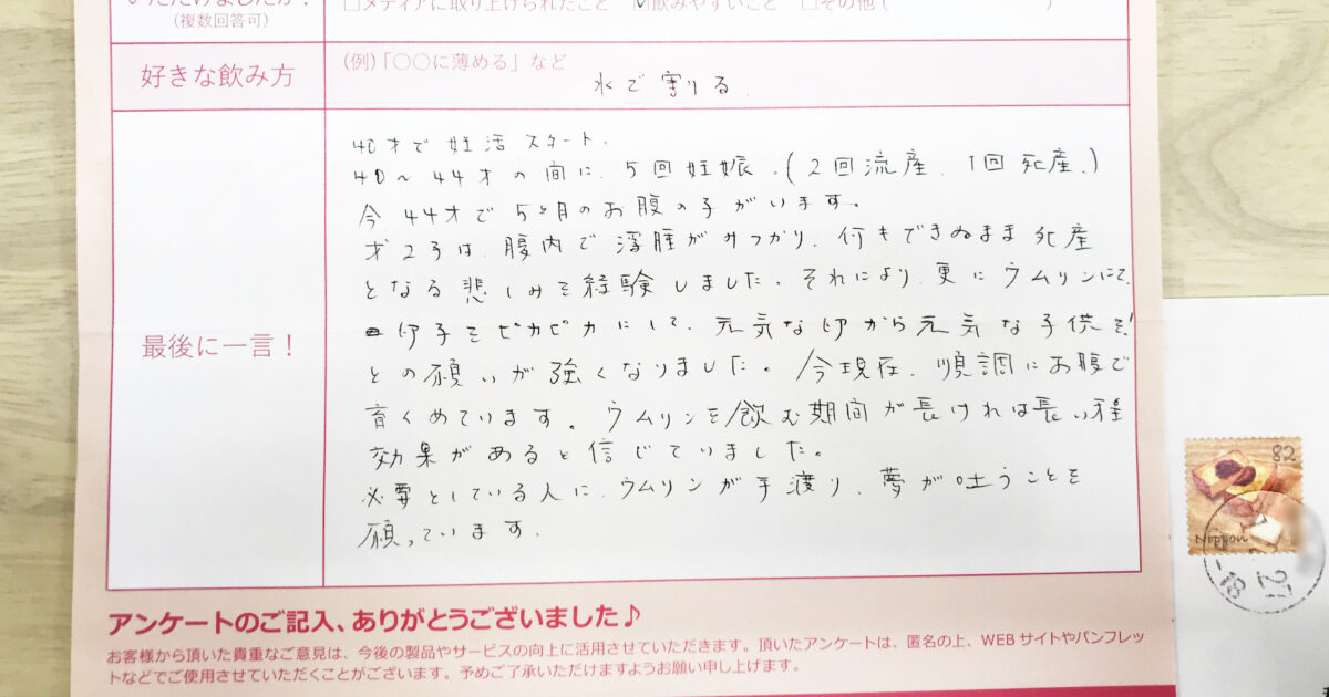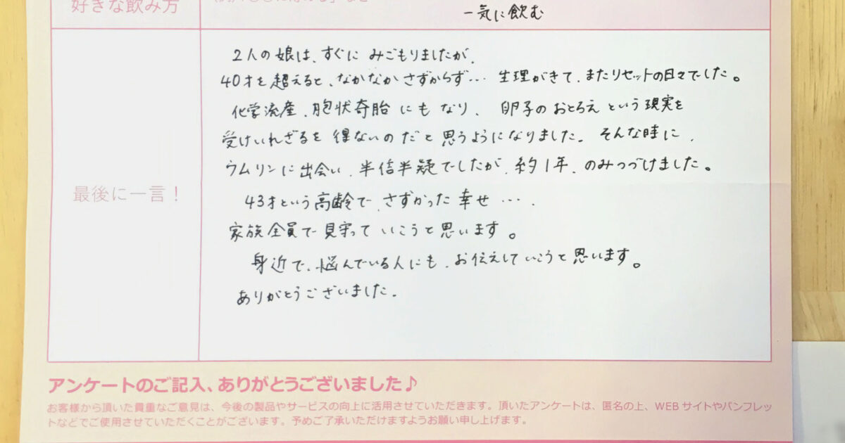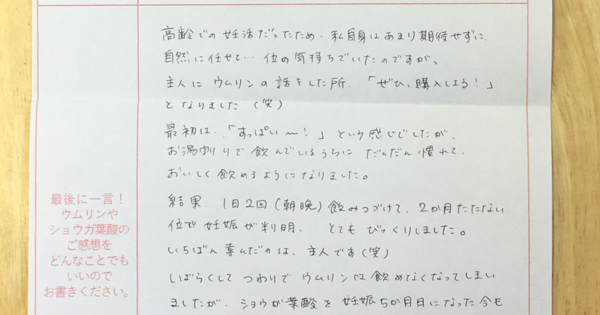 高齢での妊活だったため、私自身はあまり期待せずに自然に任せて…位の気持ちでいたのですが、主人にウムリンの話をした所「ぜひ、購入しよう!」となりました(笑)最初は、「すっぱい~!」という感じでしたが、お湯割りで飲んでいるう […]