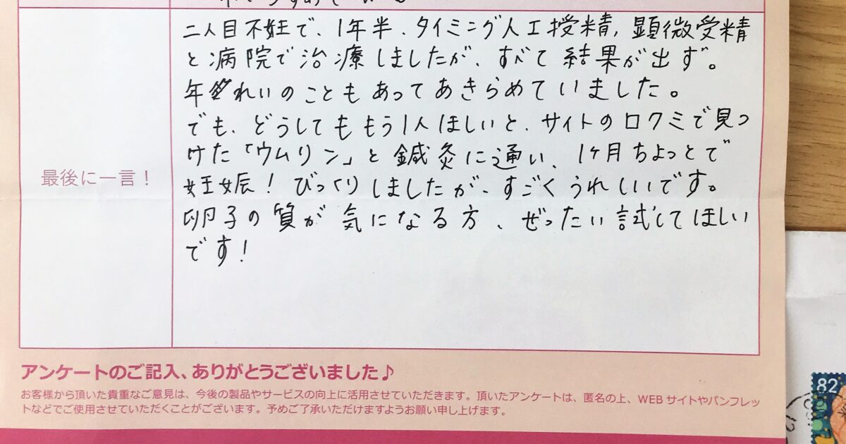 もっと早くウムリンに出会っていたらなぁと思います。 美味しいし、体にも良いし、妊娠希望の方は試す価値ありです。 今は葉酸サプリメントで安産目指しています。