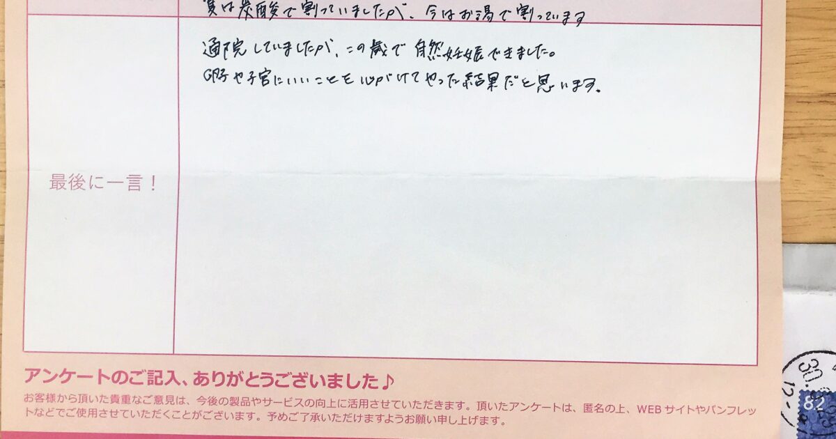 通院していましたが、この歳で自然妊娠できました。卵子や子宮にいいことを心がけてやった結果だと思います。