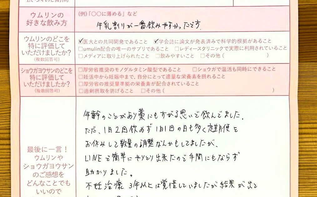 何ができるか考えウムリンに出会いました。飲みやすい味で苦なく続けられたのも大きなポイントでした。(すごく好きな味でした)ウムリンにも感謝です!”続けていける事”(味・価格・手軽さなど)がすごく大切だと思います。