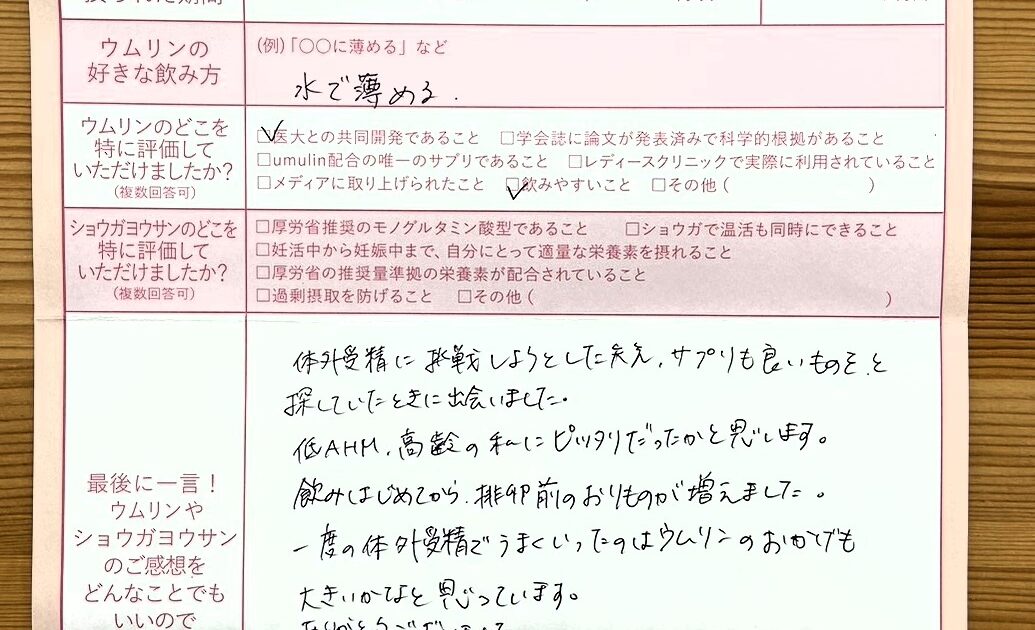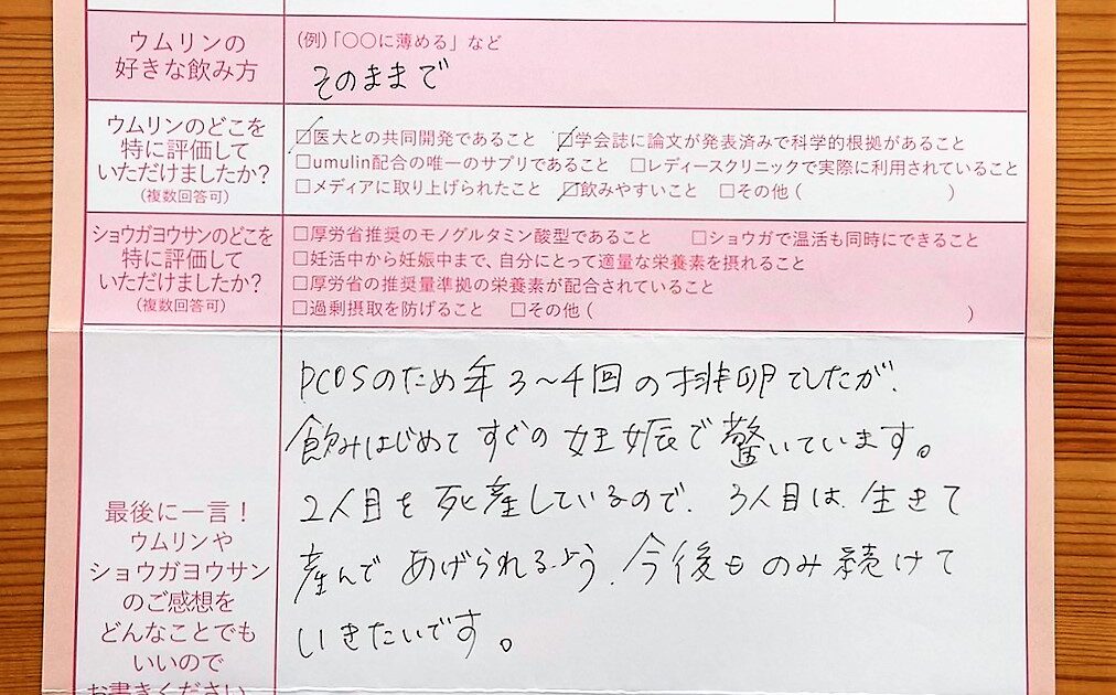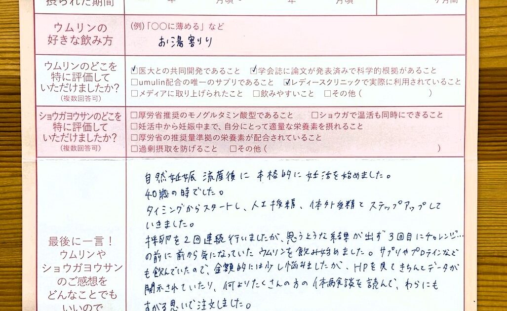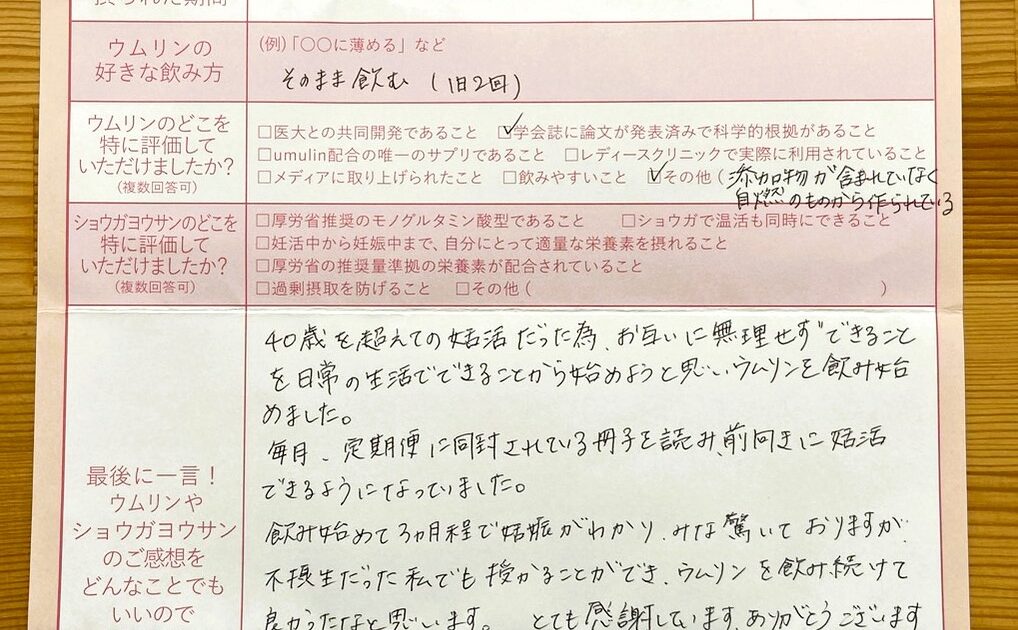40歳を超えての婚活だった為、お互いに無理せずできることを日常の生活でできることから始めようと思いウムリンを飲み始めました。毎月、定期便に同封されている冊子を読み、前向きにできるようになっていました。みな驚いておりますが […]
