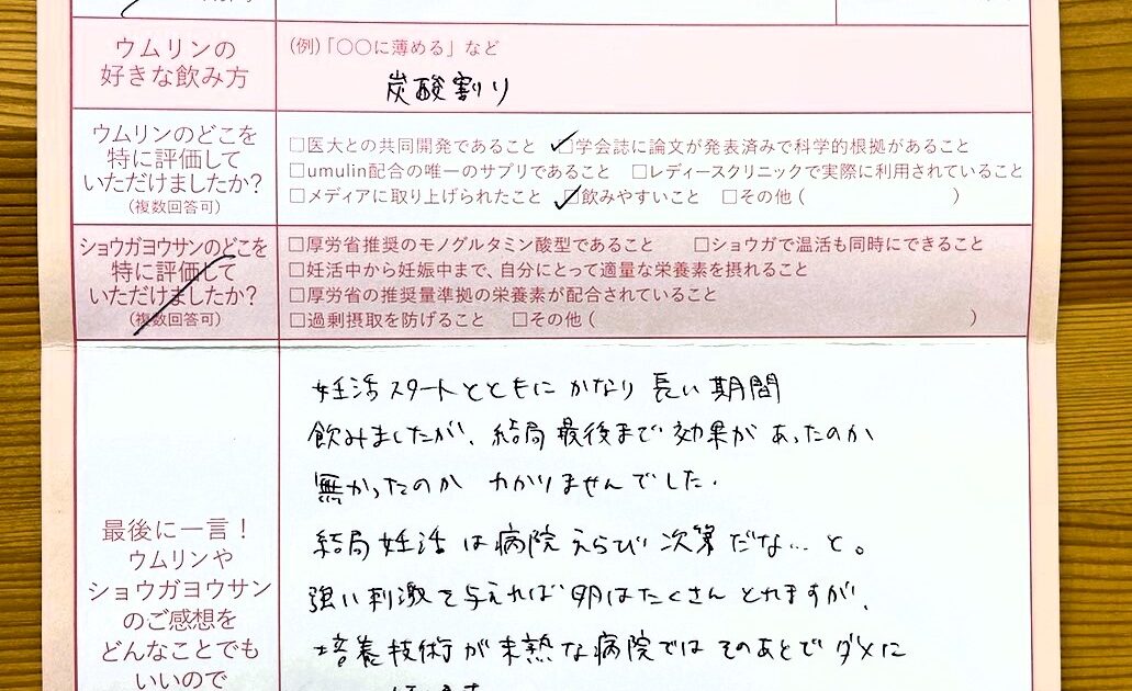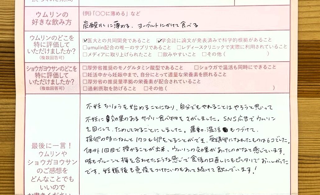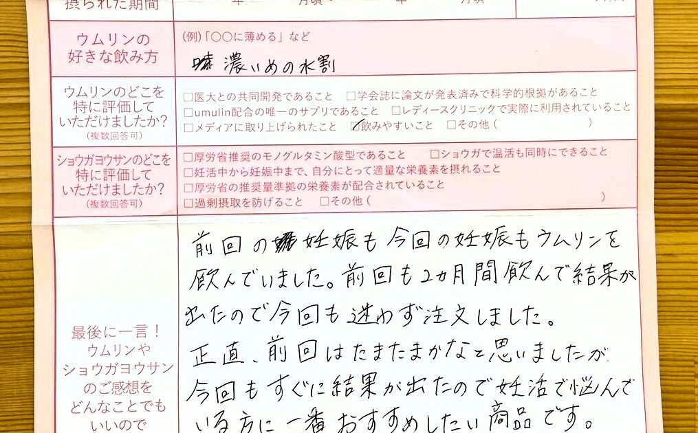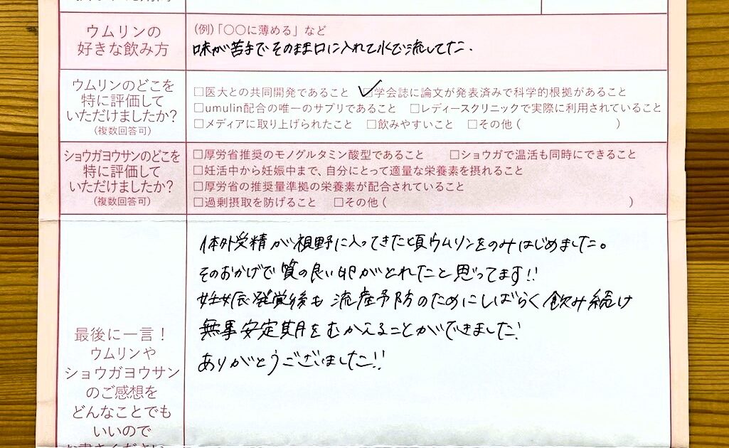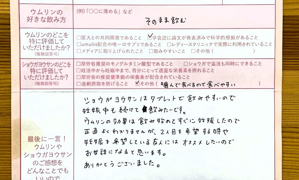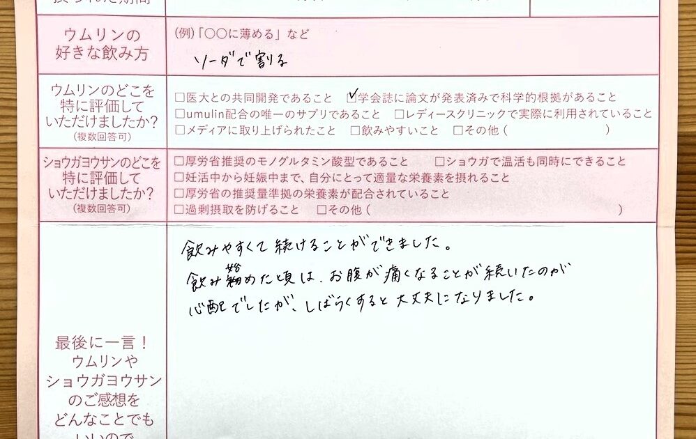 ショウガヨウサンはタブレットで飲みやすいので妊娠中も続けて飲みたいです。ウムリンは飲み始めてすぐだったので正直よくわかりませんが、友人にはオススメしたいのでお世話になると思います。ありがとうございました。