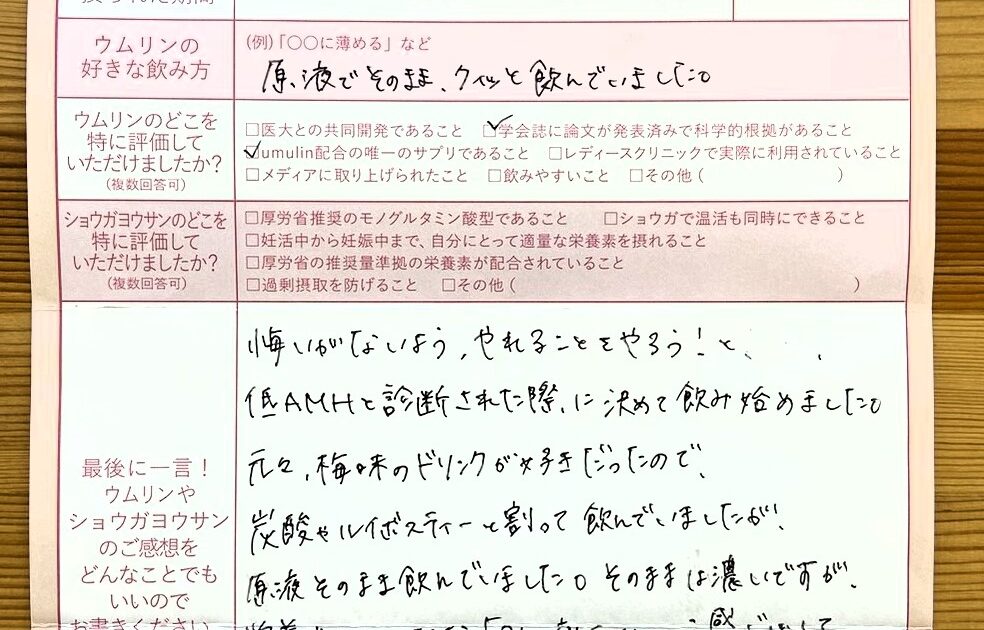 自分でもやれることはやろうと思ってサプリ・食べ物をさがしました。SNS広告でウムリンを目にして、ためしてみることにしました。味もプルーンと梅を合わせたような感じで食後の口直しにもピッタリでおいしかったです。妊娠後も続けて […]