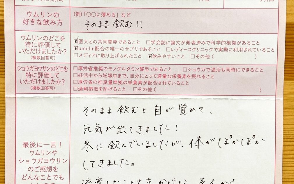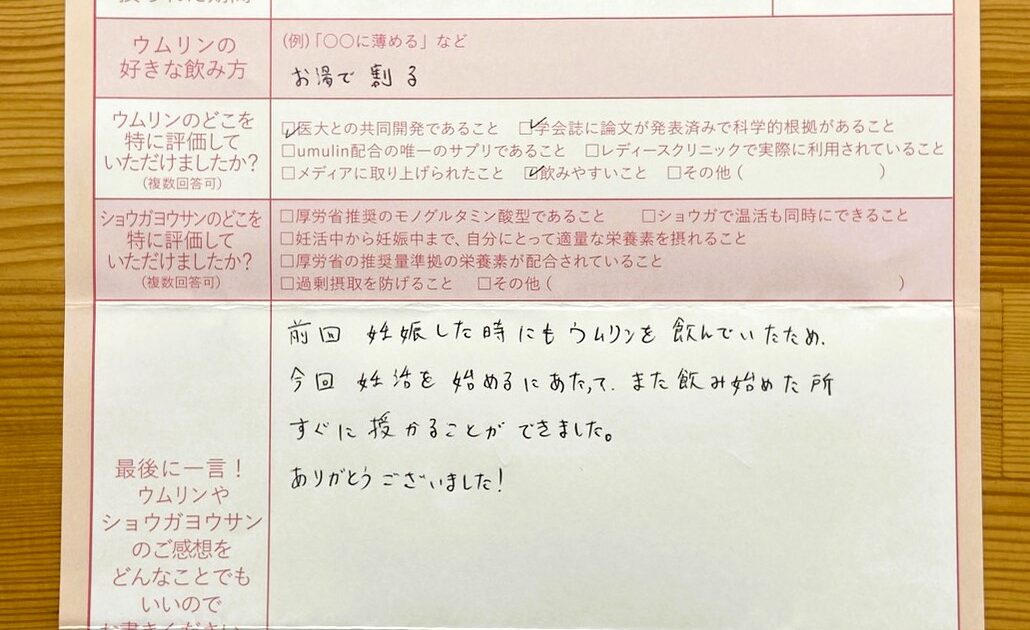 ウムリンとショウガヨウサンを毎日忘れずに飲んでいて、良かったと思いました。妊婦健診もクリアできているので、このまま無事出産までいきたいと思います。