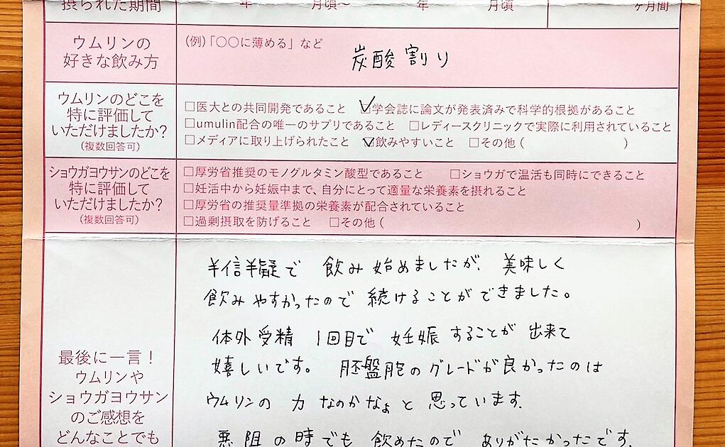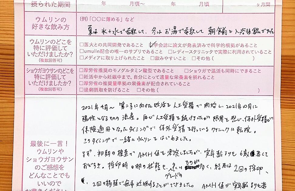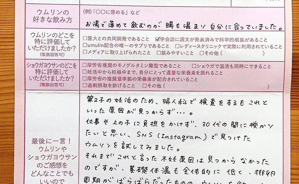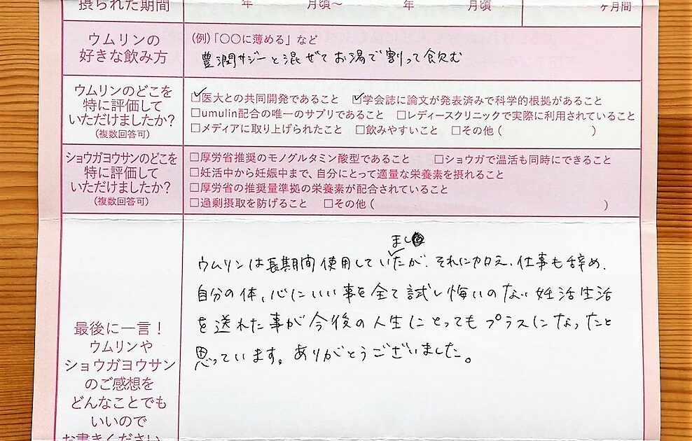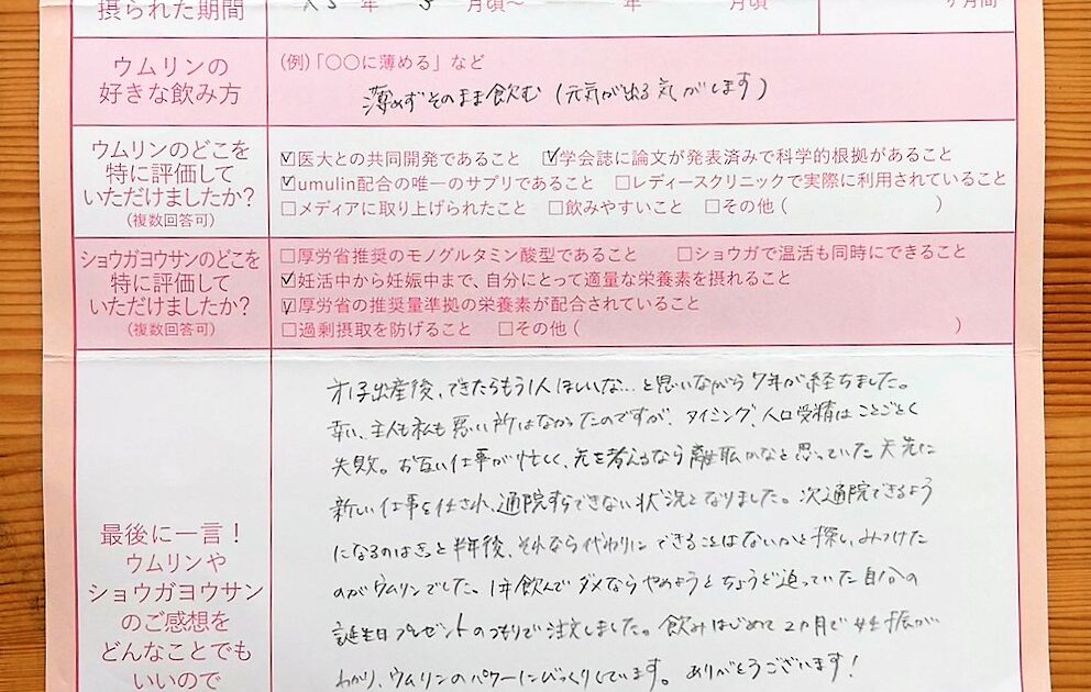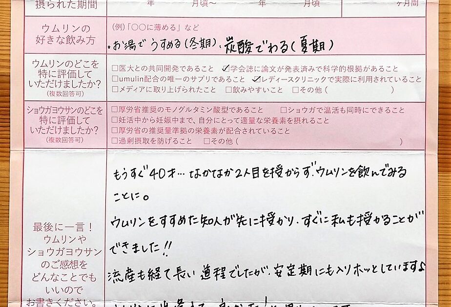 ウムリンは長期間使用していましたが、それに加え、仕事も辞め、自分の体、心にいい事を全て試し悔いのない妊活生活を送れた事が今後の人生にとってもプラスになったと思っています。ありがとうございました。