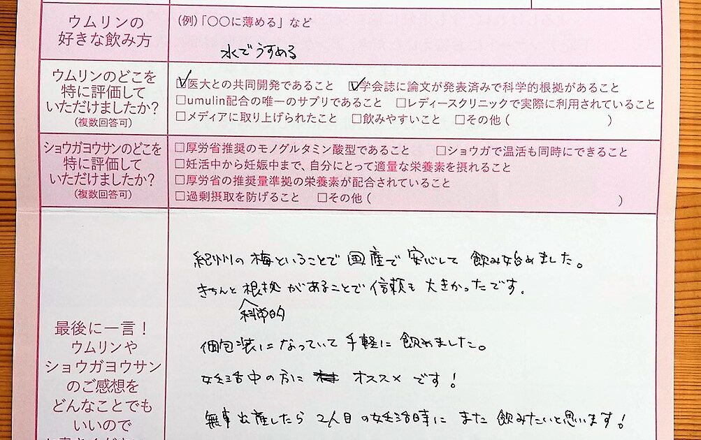 知人からウムリンを教えてもらい、飲み始めました。ウムリンに心から感謝しています。ありがとうございました!!