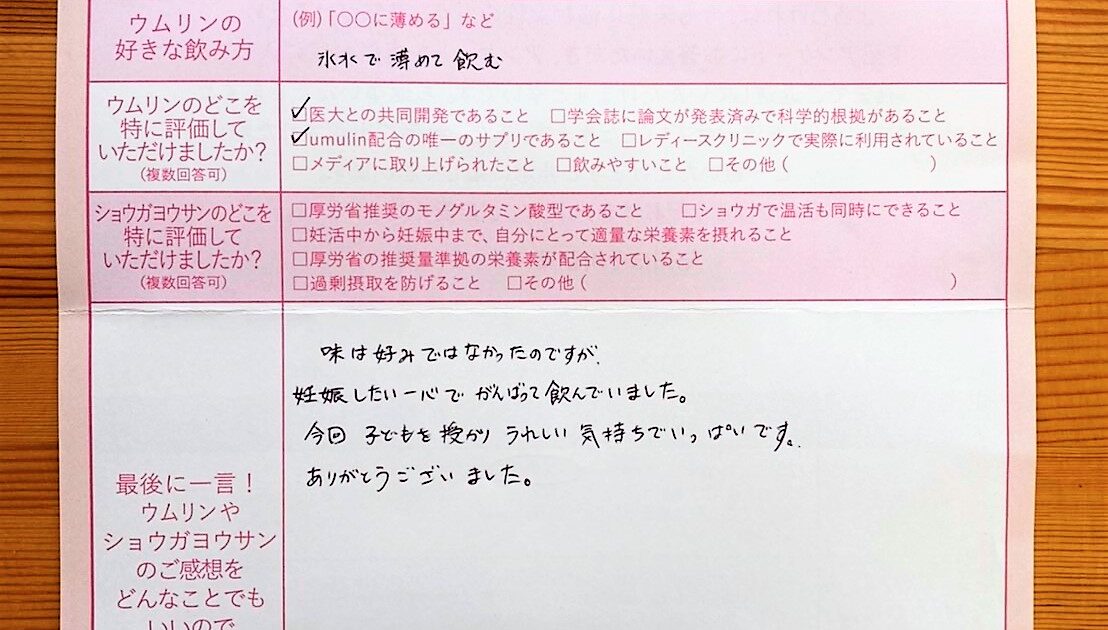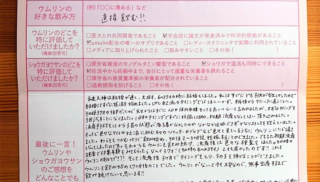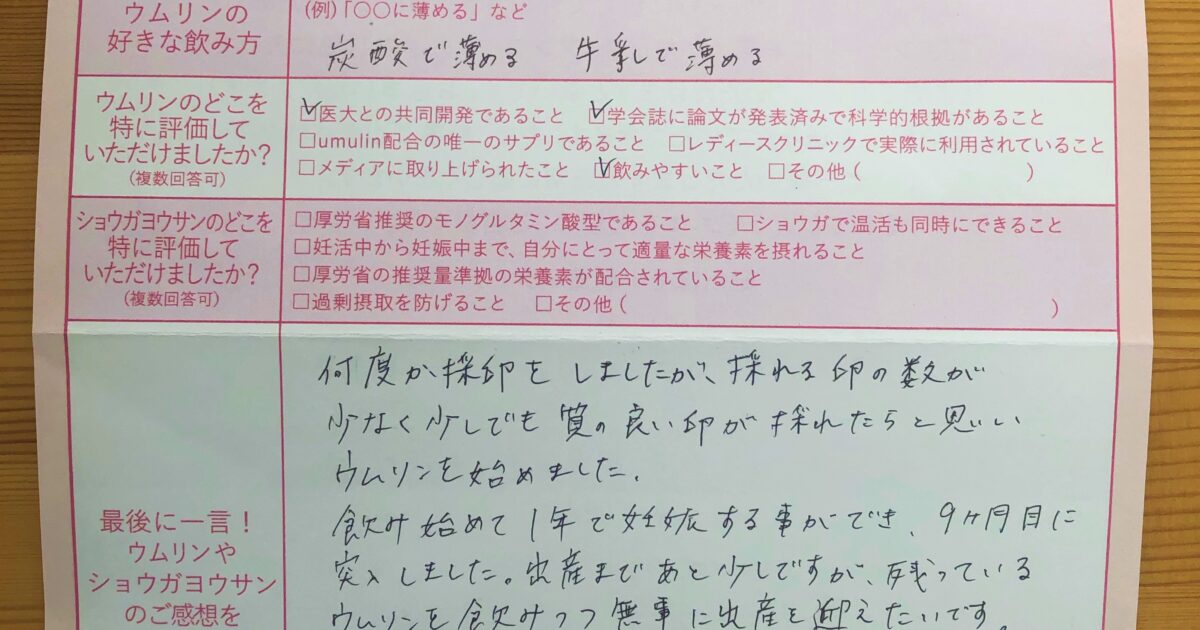 私達夫婦は結婚が遅く、夫38才、私37才の時に結婚をしました。ネットで色々なサイトやツイッターやブログなど色々と見ているうちにウムリンにたどり着きました。ウムリンがないと今も不安なので、無事出産するまで飲み続けたいと思い […]