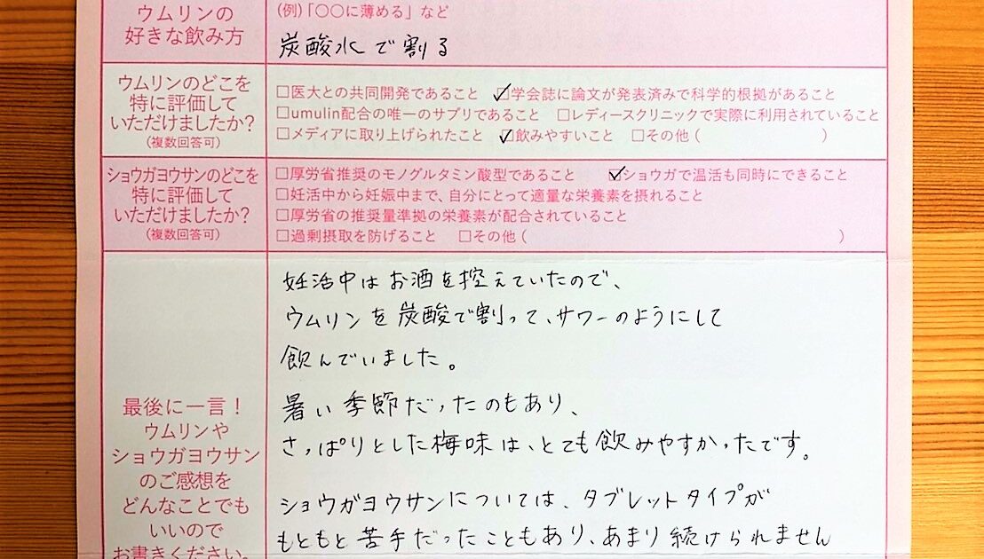 ウムリンは気になりつつ、元々梅干が苦手なことや高いこともあり迷っていましたが思い切ってできることはやろう!と購入しました。梅の酢っばさもなく、飲みやすかったです。ありがとうございました!