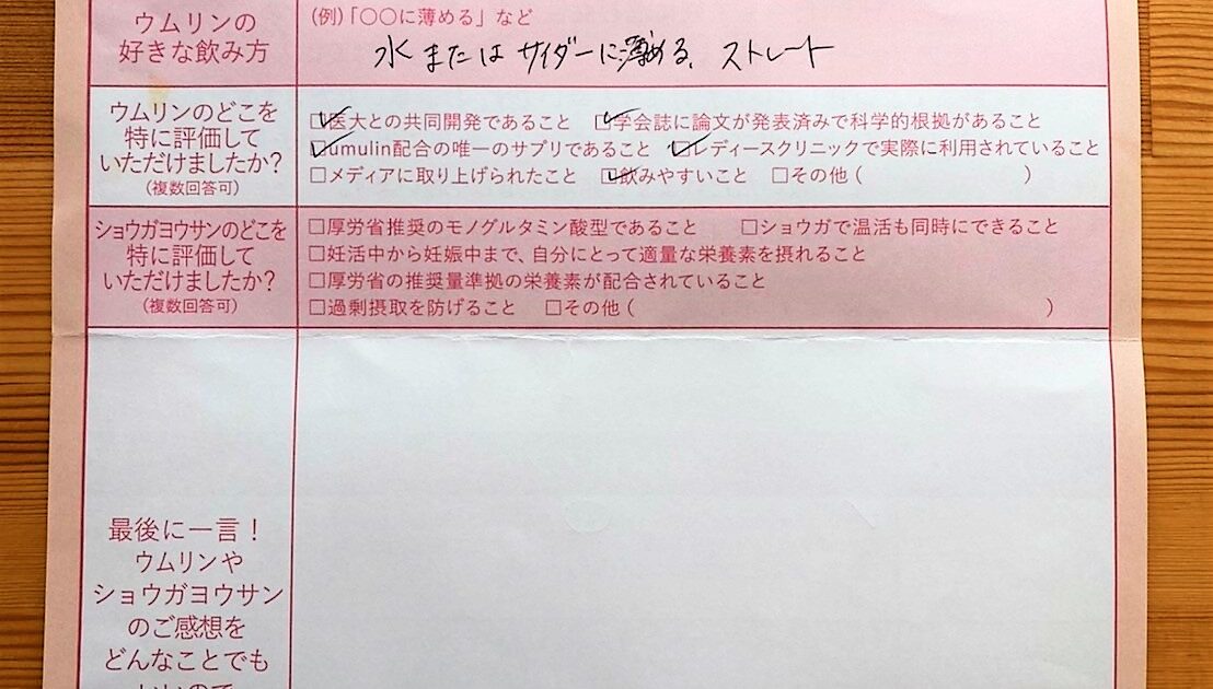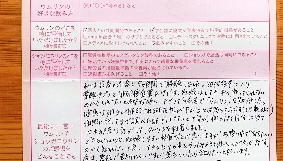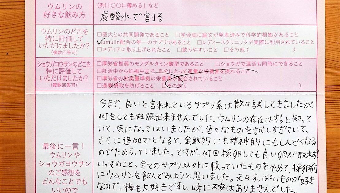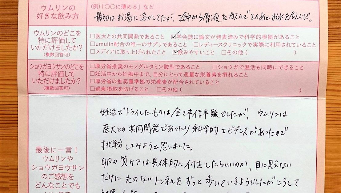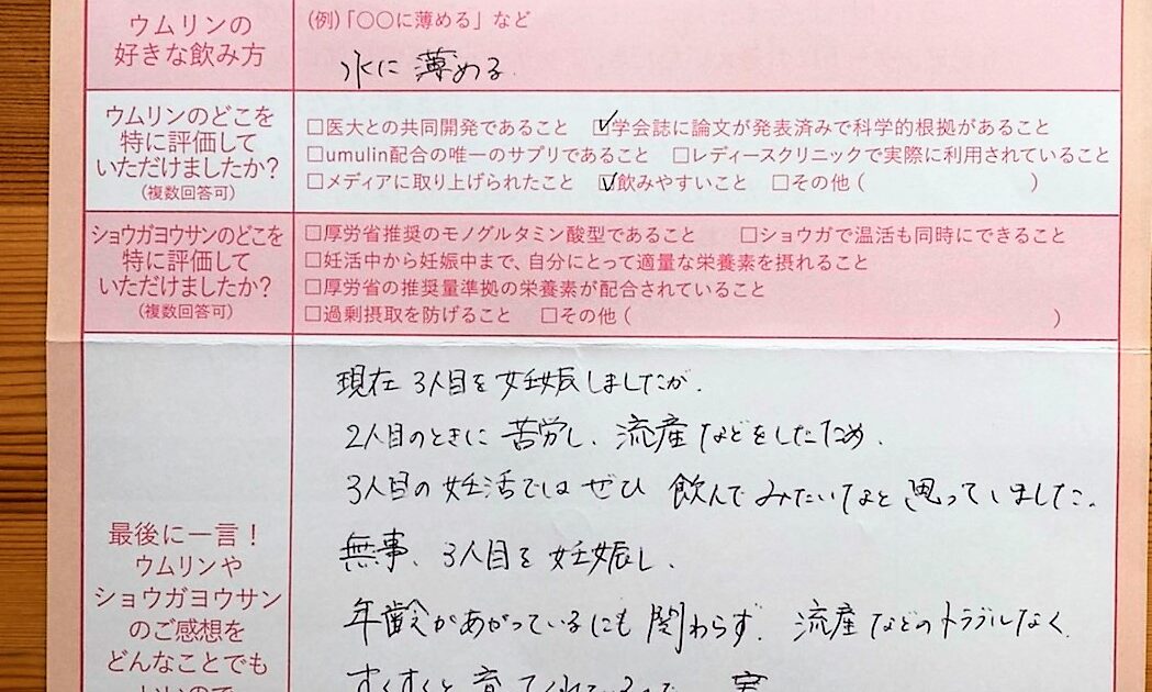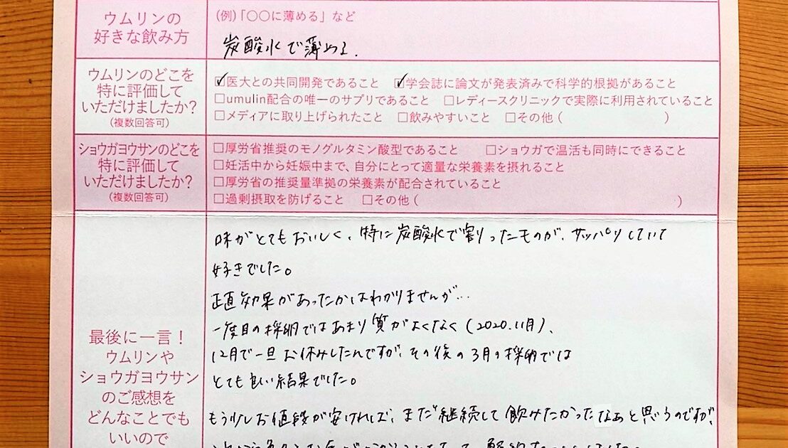 こちらのウムリンの情報をSNSで知り、飲むようにしました。最初は飲み口が私には苦手で(梅が嫌いな為)低抗がありましたが毎日2回飲み続ける事で好きな味になりました(笑)奇跡を起こせました☆ありがとうございました。