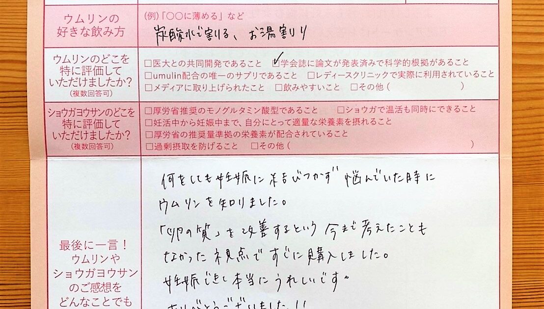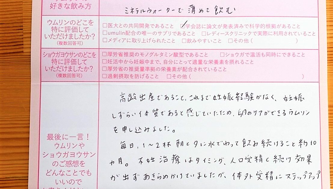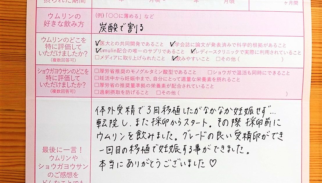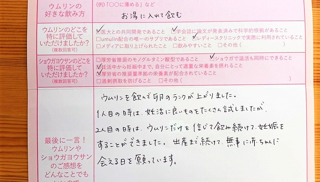 ウムリンを申し込みました。毎日、1~2杯朝と夕に水でわって飲み続けること約10ヵ月。ウムリンを信じて飲み続けたおかげだと思っています。本当にありがとうございました!