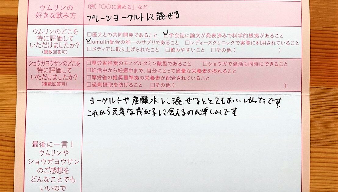 ダメ元で色々な事にチャレンジしてました。ウムリンに期待したくて2週間くらいでしたが飲み続けました。ウムリンの味はすっぱい漢方みたいな印象です。卵ケア入門セットの味よりもう1種類の方が飲みやすかったです。ありがとうございま […]