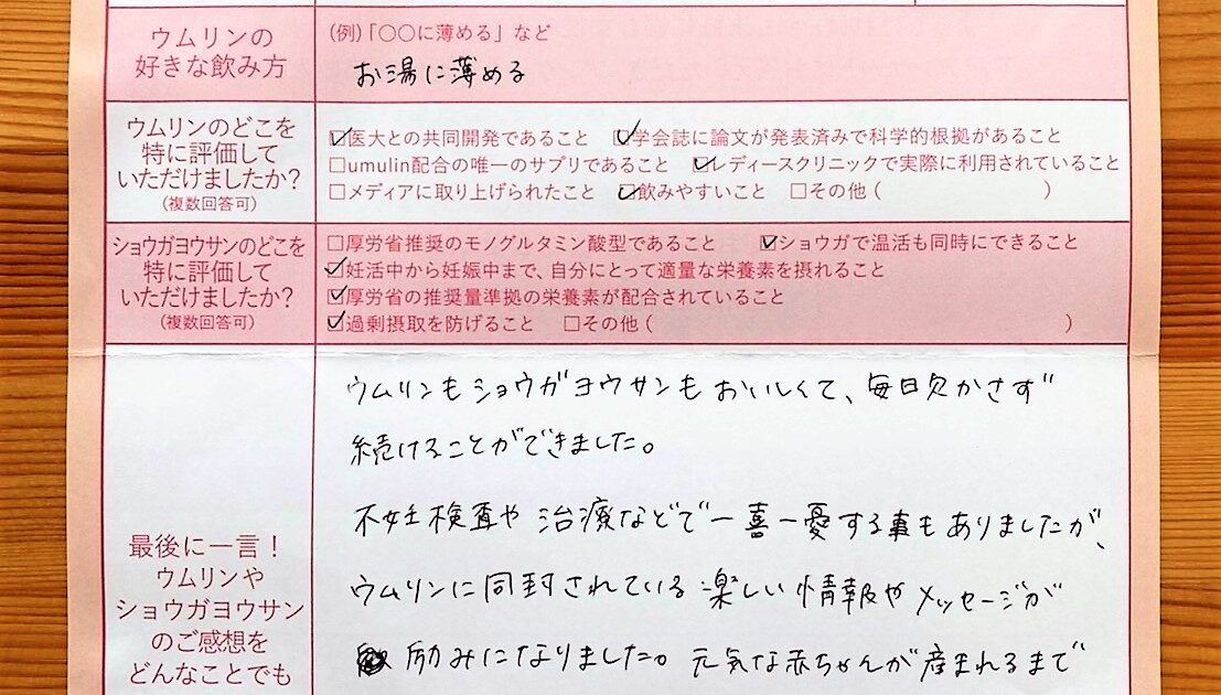 ウムリンもショウガヨウサンもおいしくて、毎日欠かさず 続けることができました。不妊検査や治療などで一喜一憂する事もありましたが、ウムリンに同封されている楽しい情報やメッセージが励みになりました。これからも飲み続けたいと思 […]