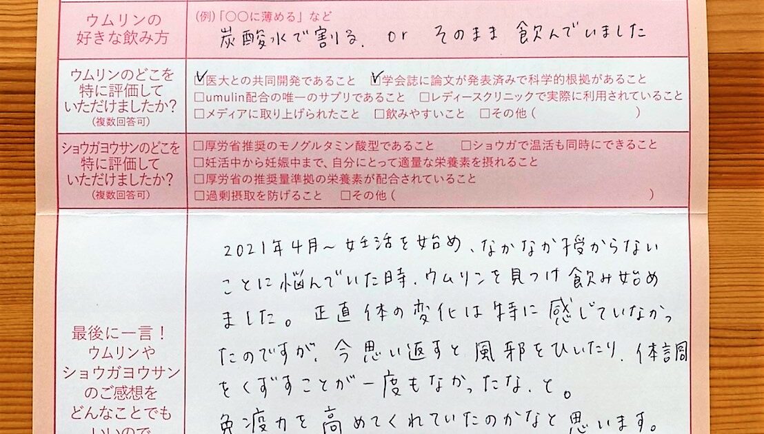 2021年4月~妊活を始め、なかなか授からないことに悩んでいた時、ウムリンを見つけ飲み始めました。おかげさまで念願が叶い、まだまだ安定期までありますが、大切に育てていきたいと思います。ありがとうございました。