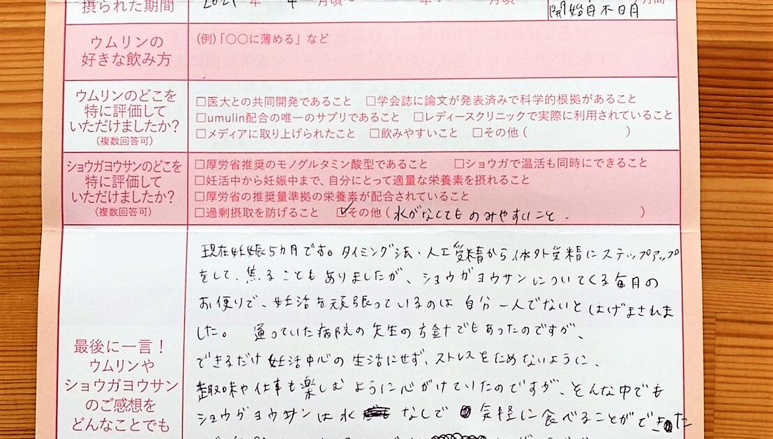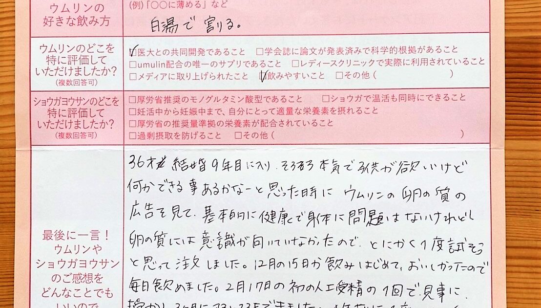 3人目の妊活をはじめ、初めて流産を経験しました。35歳という年齢も気になり始めました。数ヶ月後、2回目の流産となりましたがウムリンを毎日美味しく続けていたこともあり、あきらめず飲み続けました。今は安定期を迎え、まだ出産ま […]