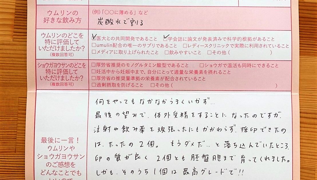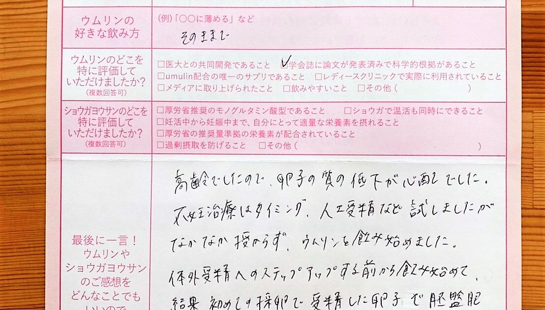 でも、年齢的なことを考えると、さすがにもう先延ばしには出来ないだろうと焦り、現実的に考え始めました。その時は、ウムリンについては知りませんでした。そこで情報を集めるうちにウムリンのことを知り、飲み始めました。祈るような気 […]