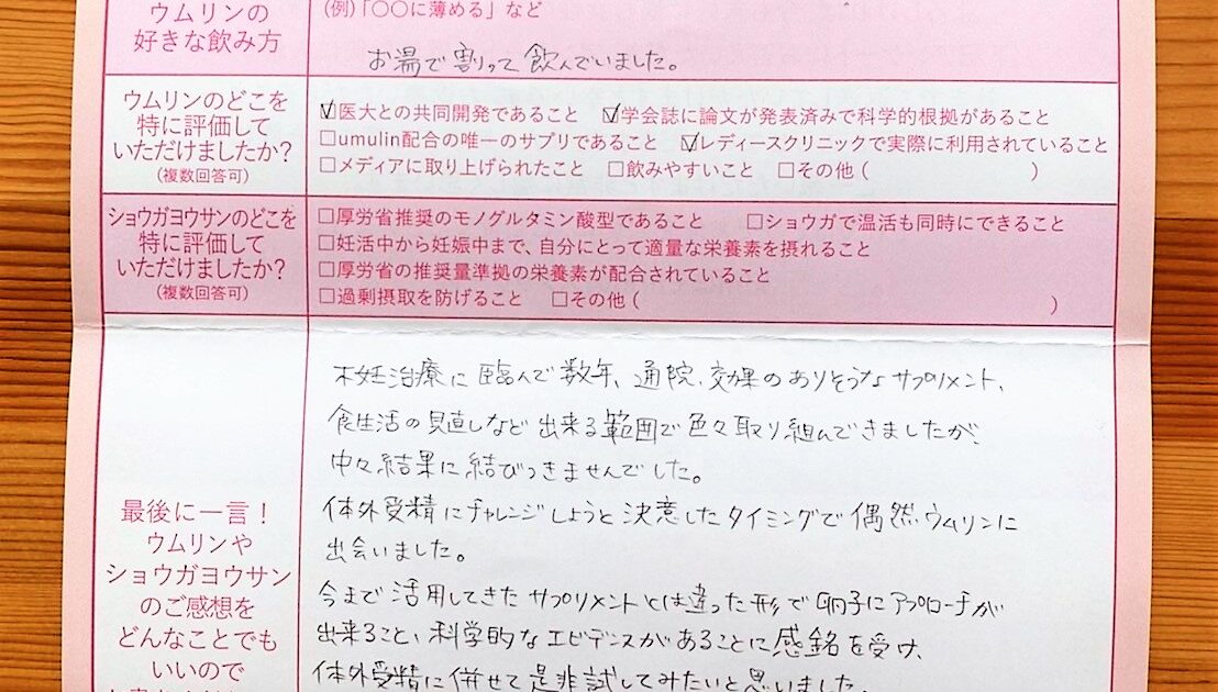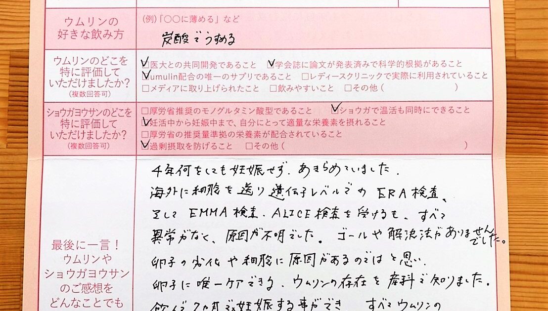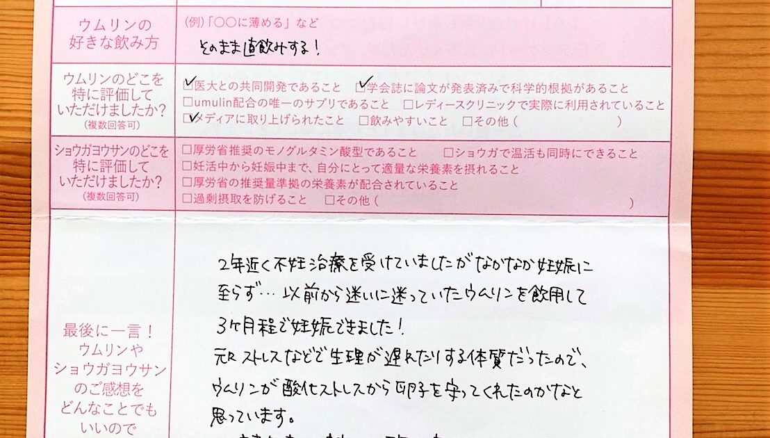 私たち夫婦は、2人目不妊でした。特に原因もなく、年齢的なこともあり、夫婦共に疲れてしまいました。1回、休もうと思った時に、ウムリンを知り、身体にいい事は何でも試してみよう!と思い、飲み始めました。半年はがんばろうと思い、 […]