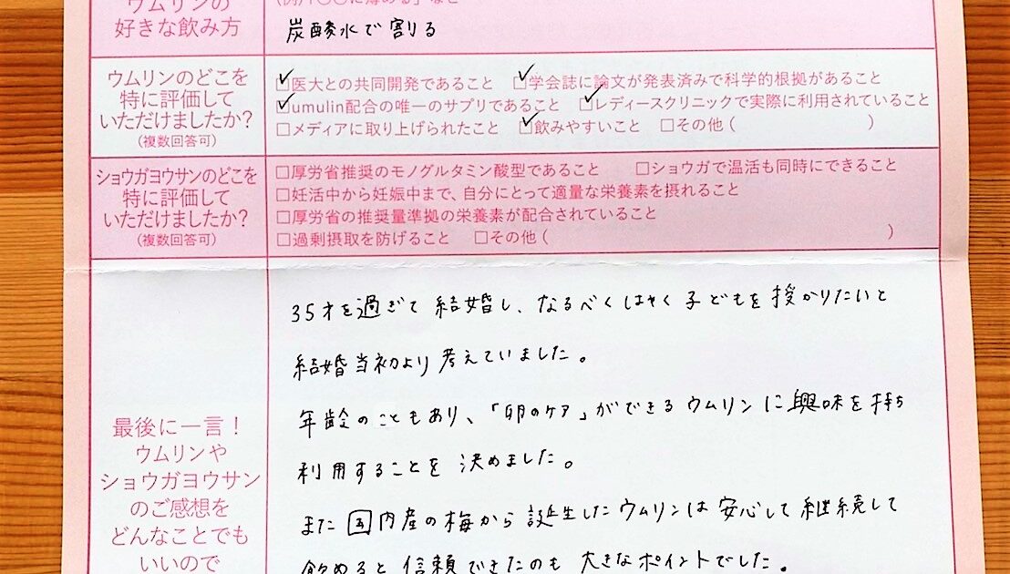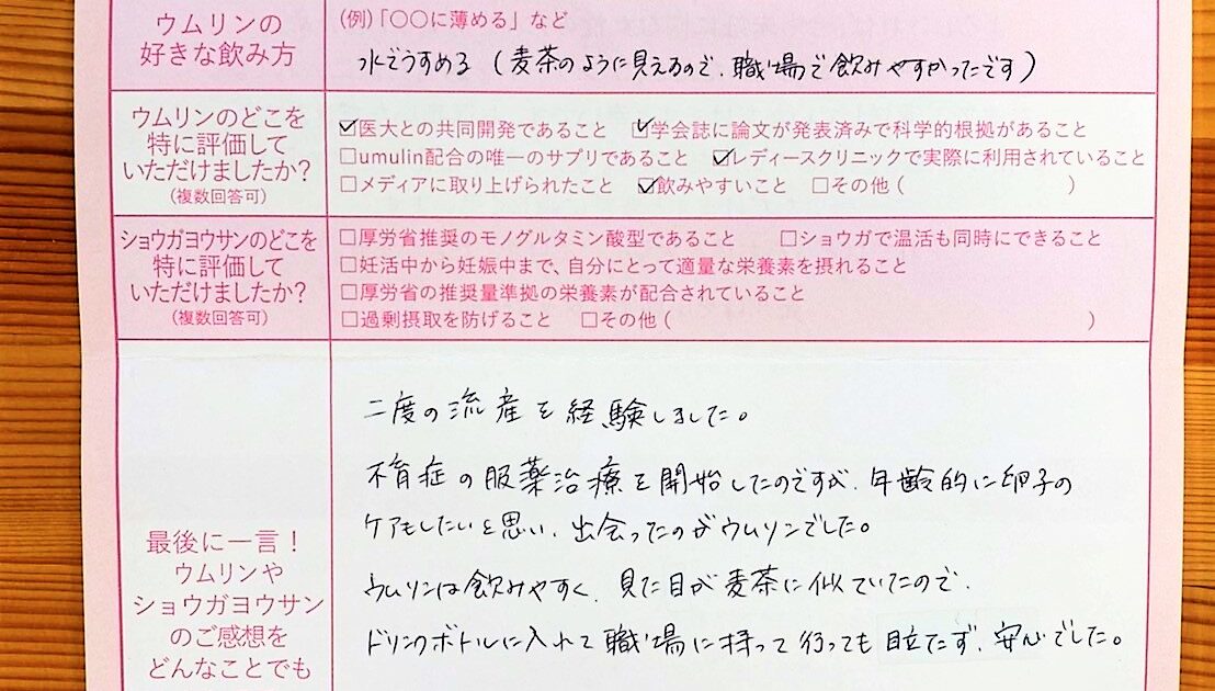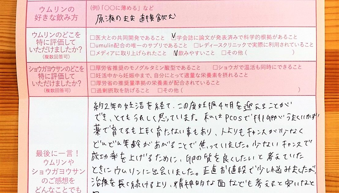 半年程前に、稽留流産となり、とても落ち込みました。37歳ということもあり、ワラをも掴む気持ちでウムリンを注文していました。ありがとうございました!!