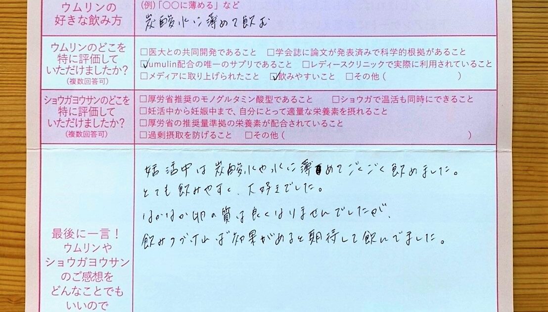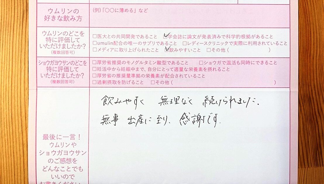 飲みやすく、続ける事が出来ました。本当にウムリンしかサプリはのんでなかったので、お陰だと思っています。ありがとうございました。