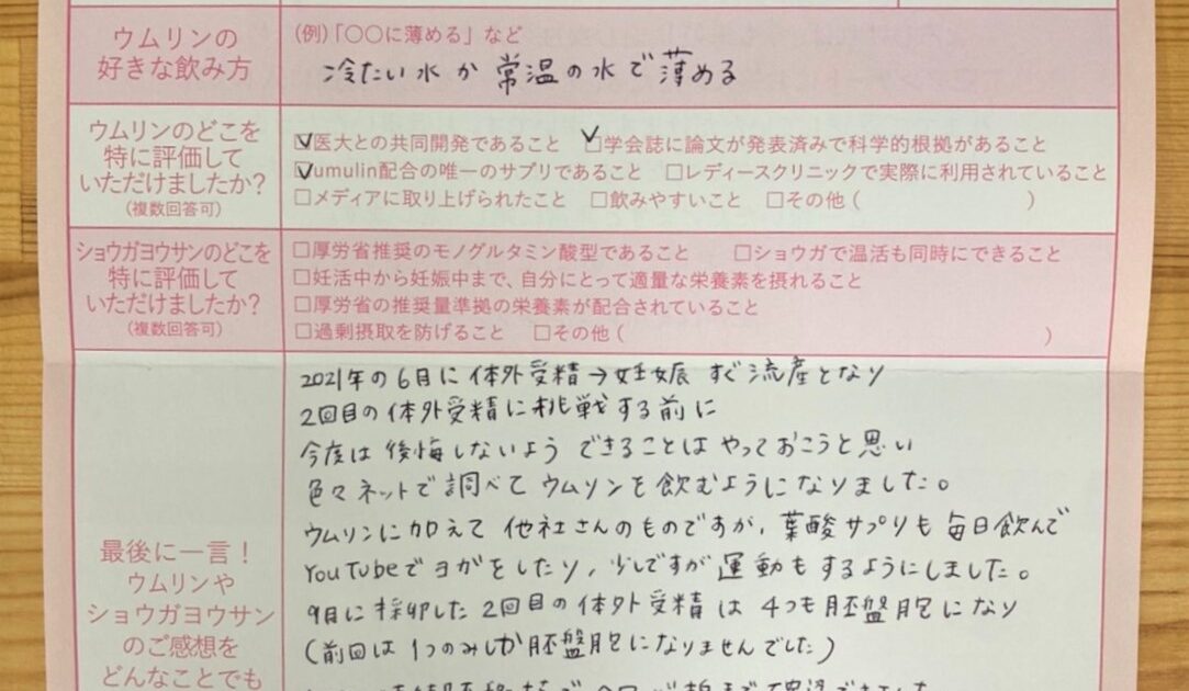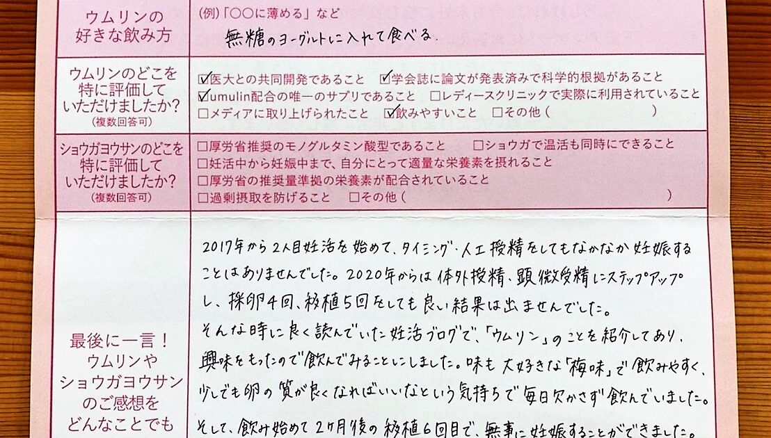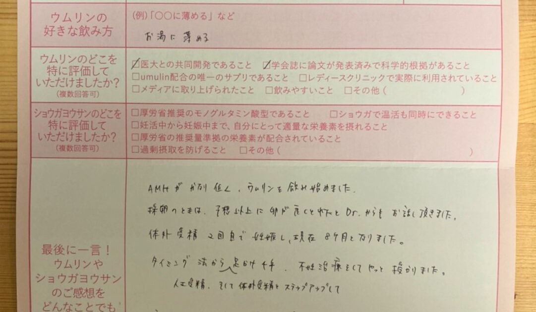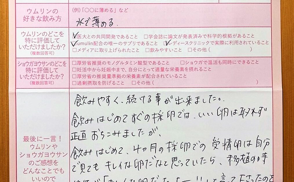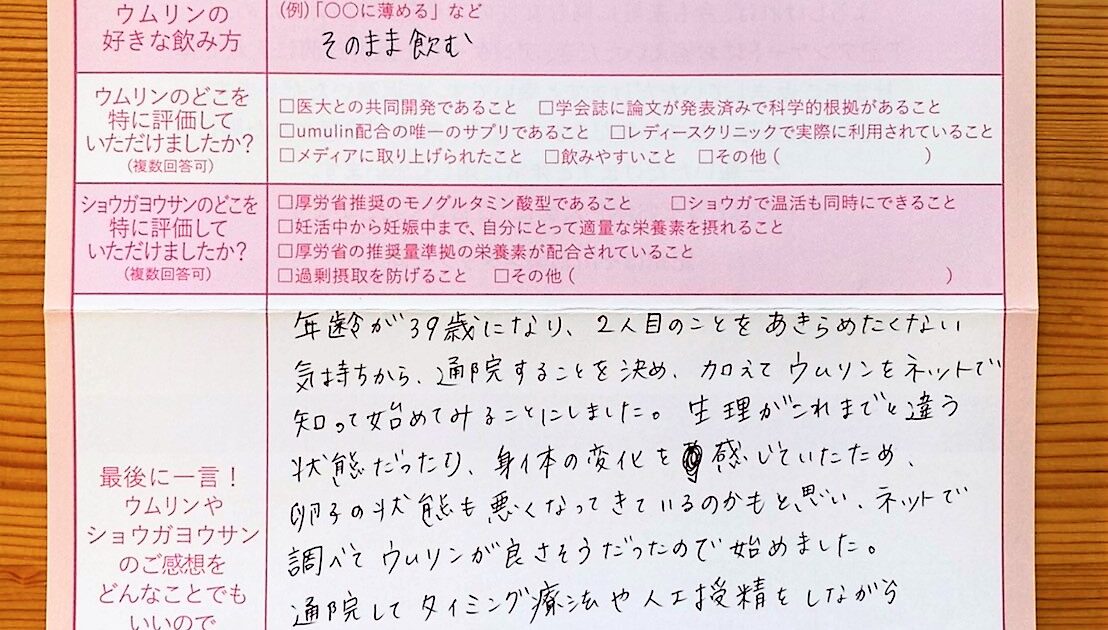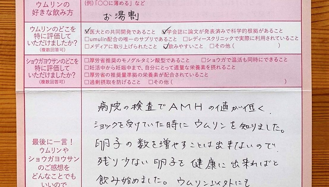 病院の検査でAMHの値が低くショックを受けていた時にウムリンを知りました。数を増やすことは出来ないので健康に出来ればと飲み始めました。
