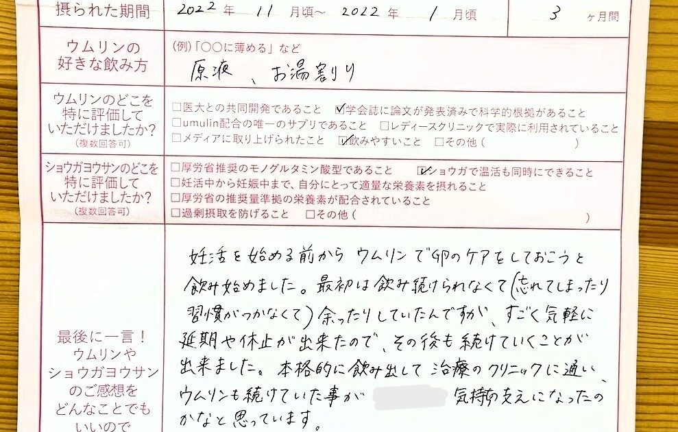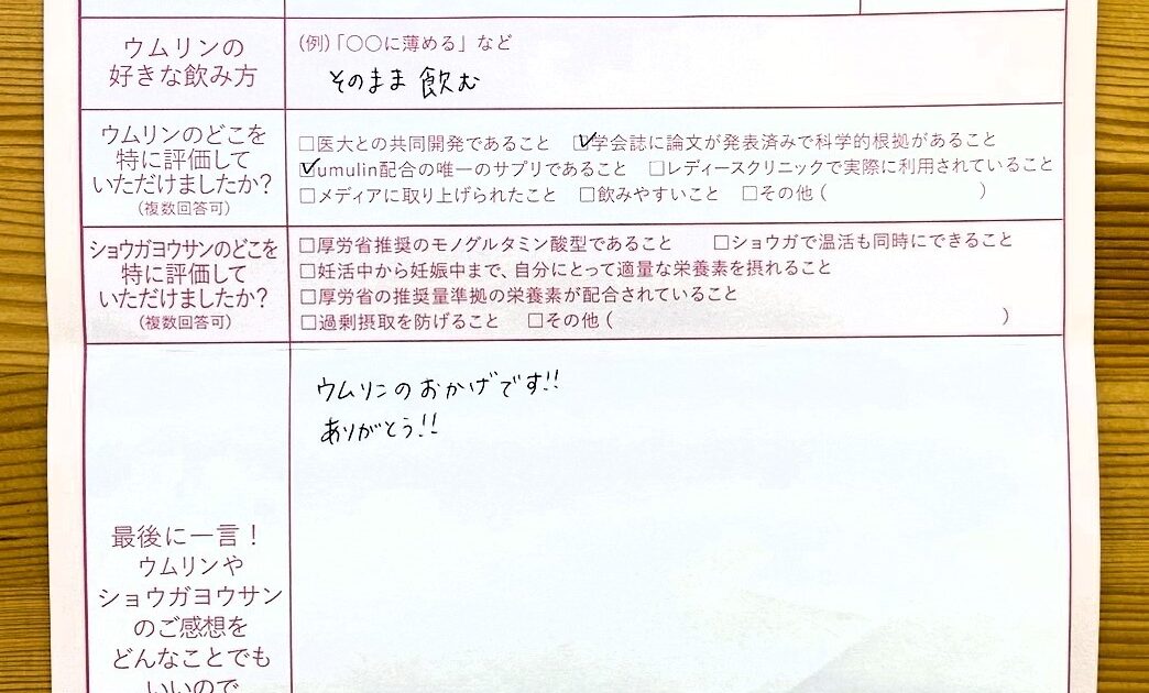 心が折れていたところウムリンに出会い、祈りながら飲み続けました。出会えてよかったです。ありがとうございます。