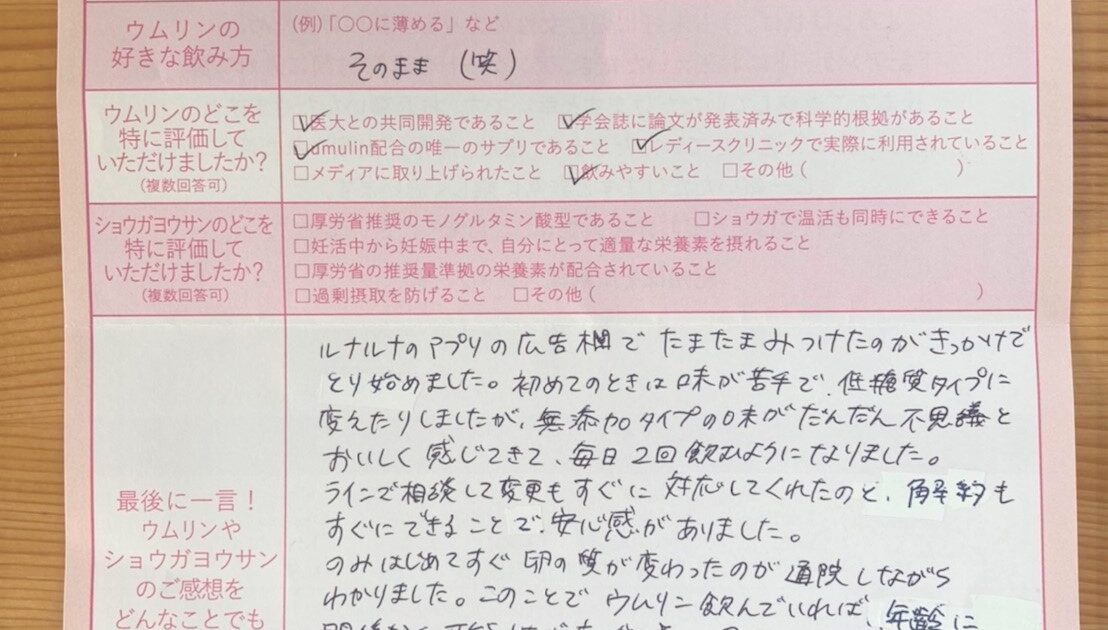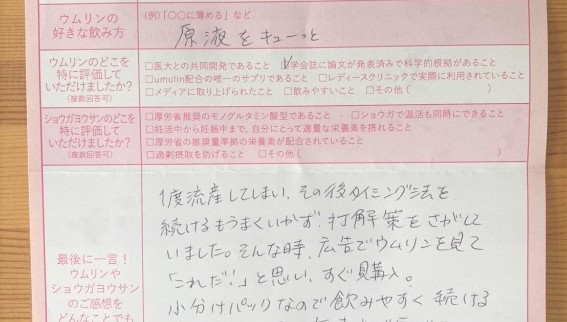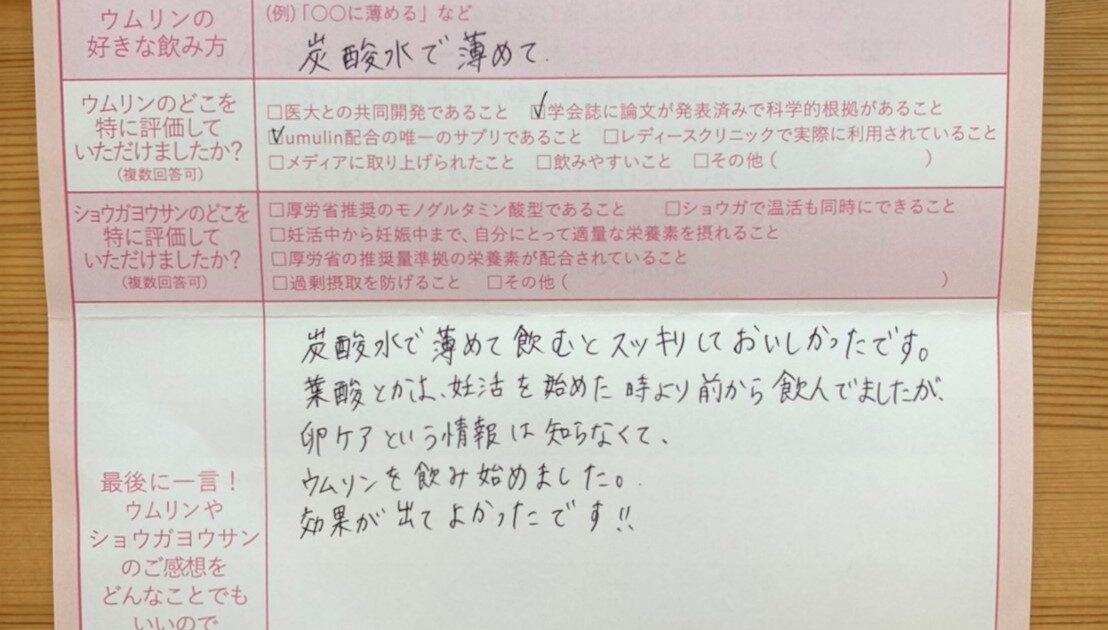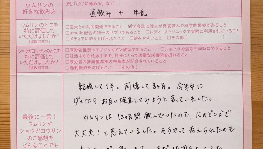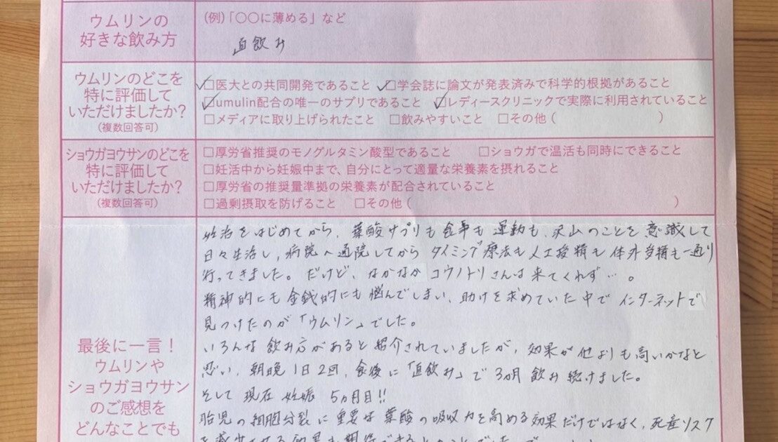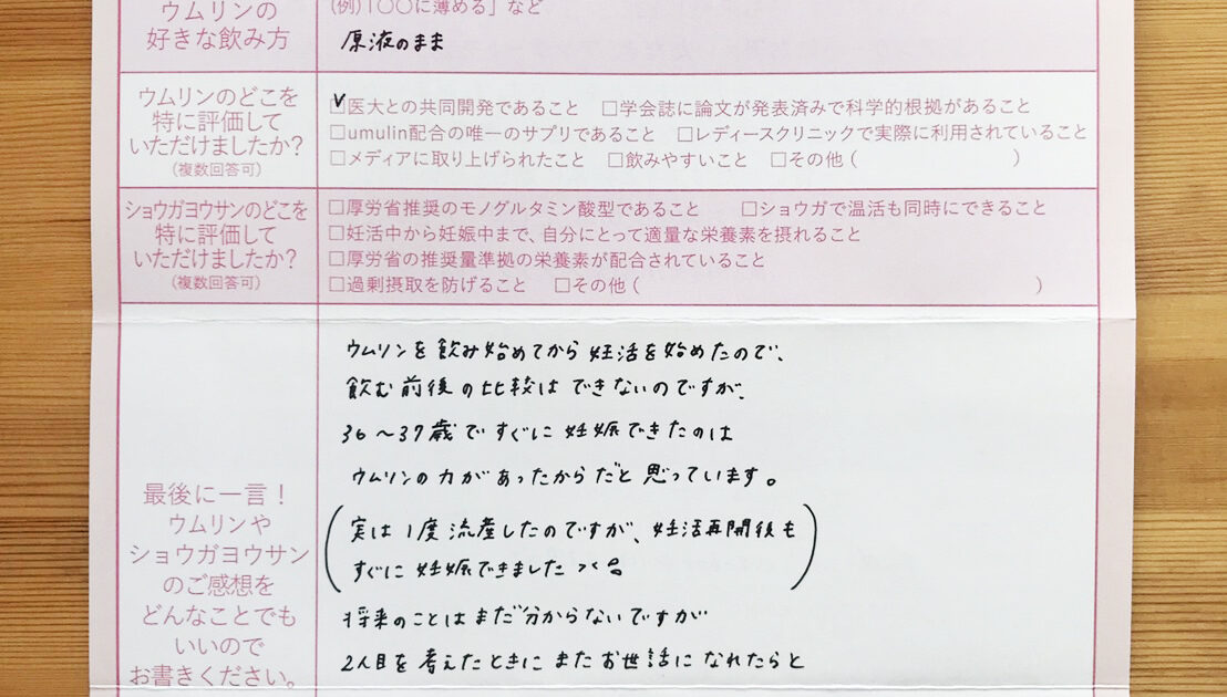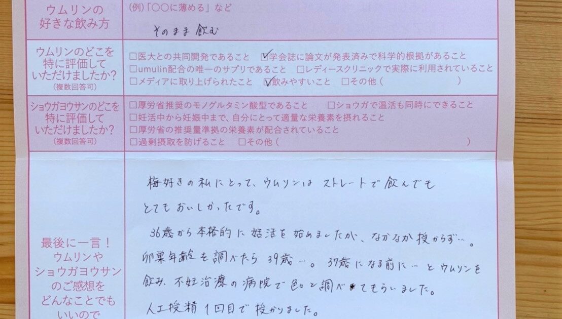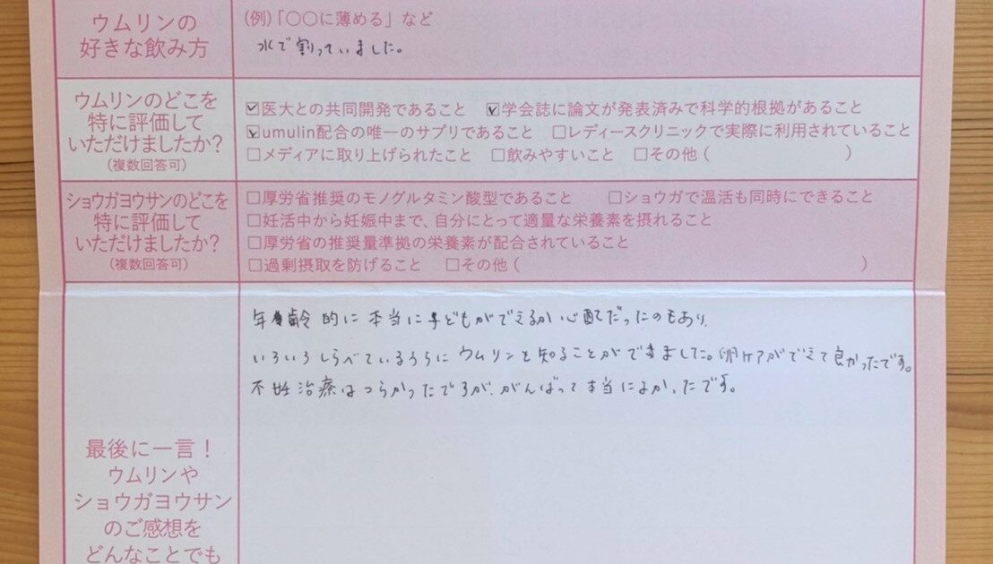 年齢的に本当に子どもができるか心配だったのもあり、いろいろしらべているうちにウムリンを知ることができました。がんばって本当によかったです。
