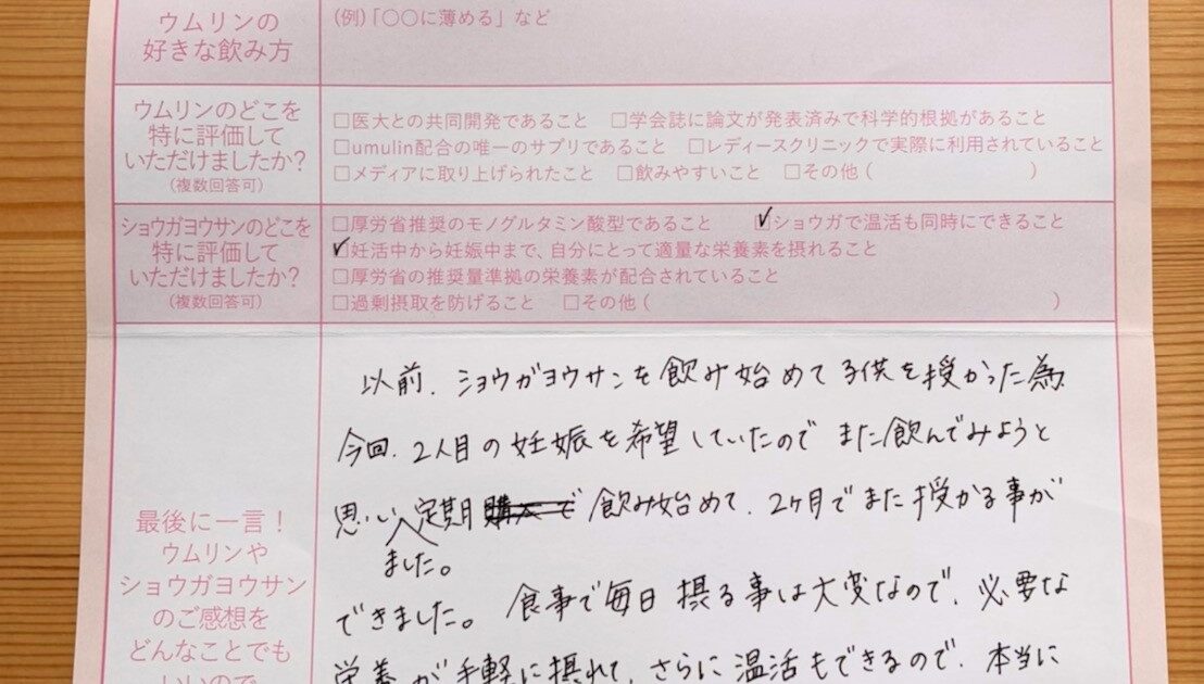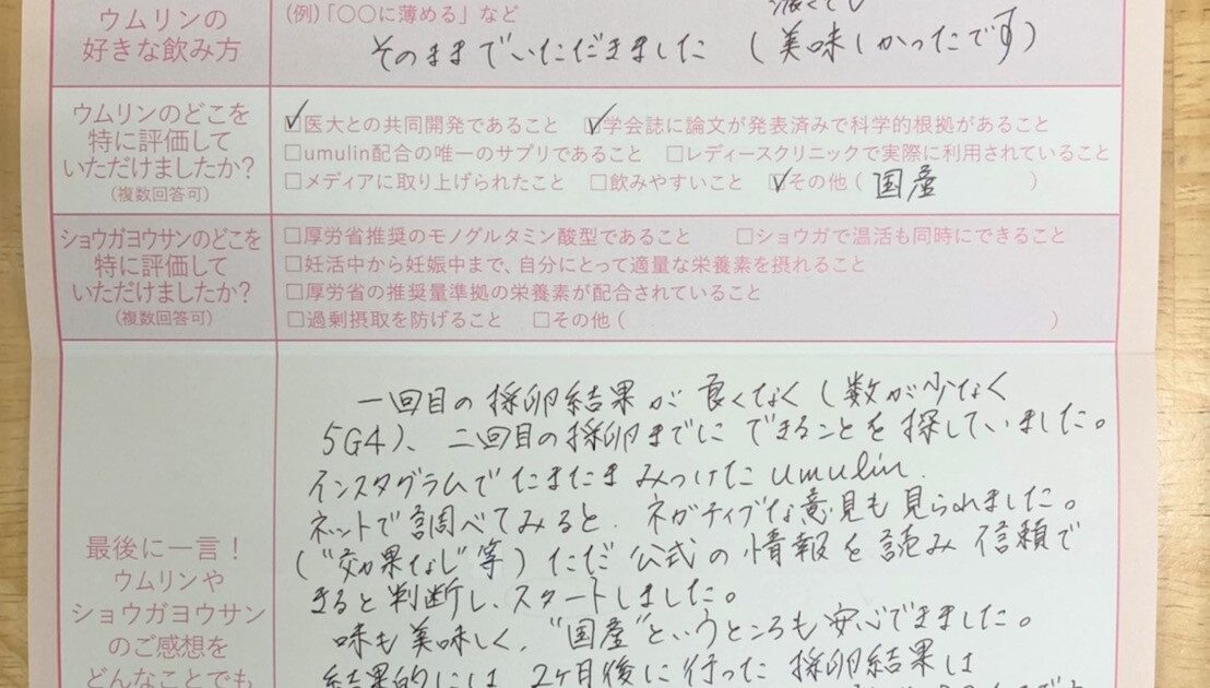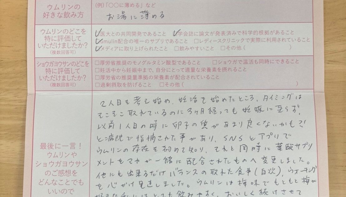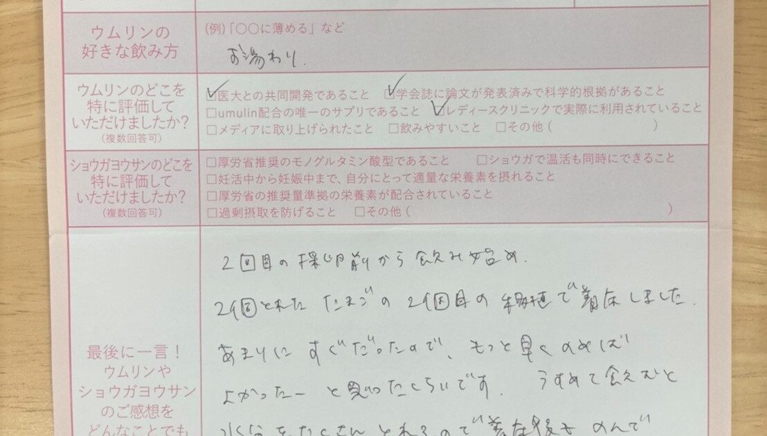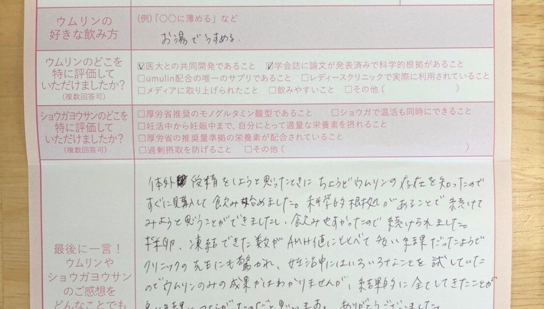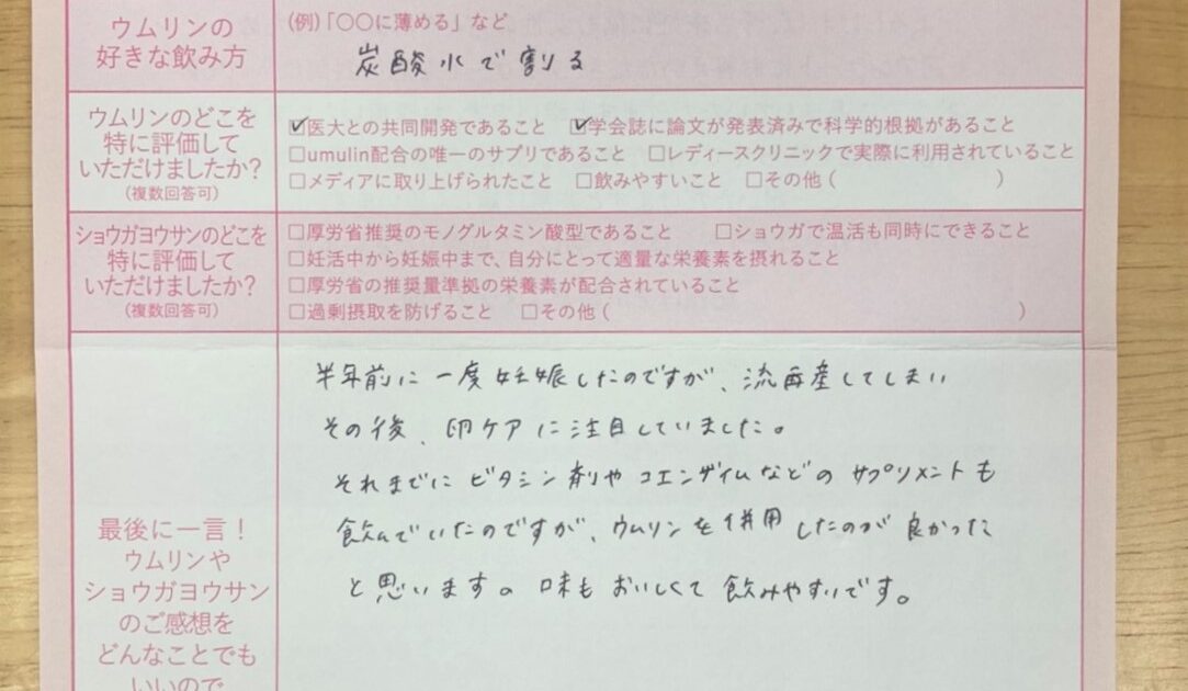 SNSとアプリでウムリンの存在を初めて知り、それと同時に葉酸サプリメントをマカが一緒に配合されたものへ変更しました。他にも出来るだけバランスの取れた食事(自炊)、ウォーキングを心がけ見直しました。ウムリンは梅味でもともと […]