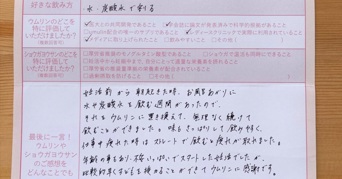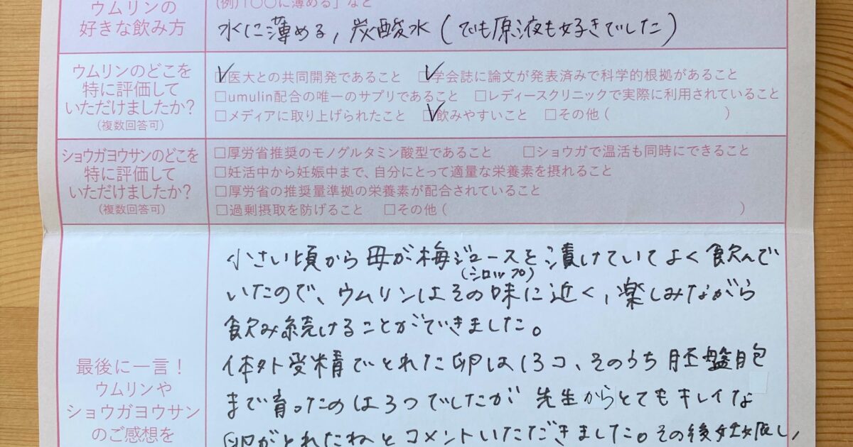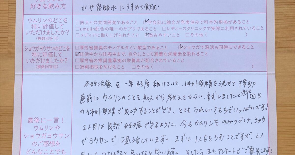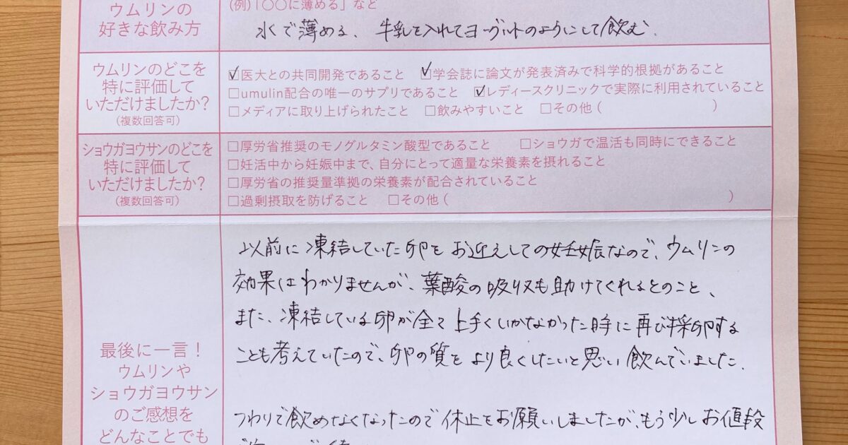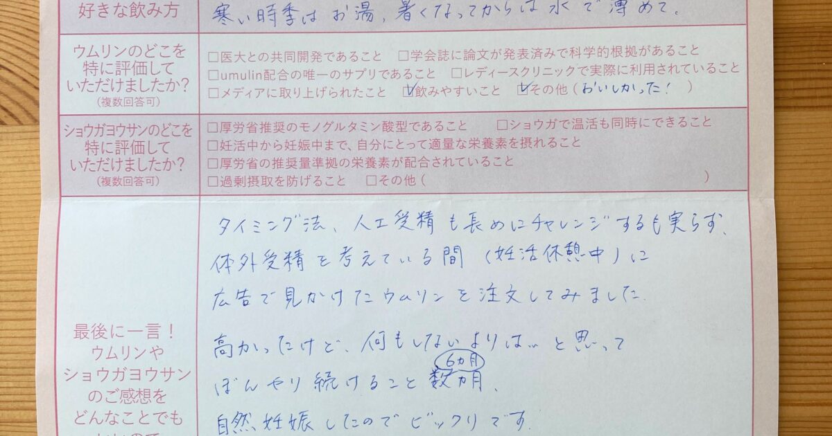 直前にウムリンのことを知人から教えてもらい、試しました。とてもうれしいきもちでいっぱいです! 今もウムリンをのみつづけ、ショウガヨウサンで温活しています。まずは1人目をうむことですが、2人目にもつながると良いなと思います […]