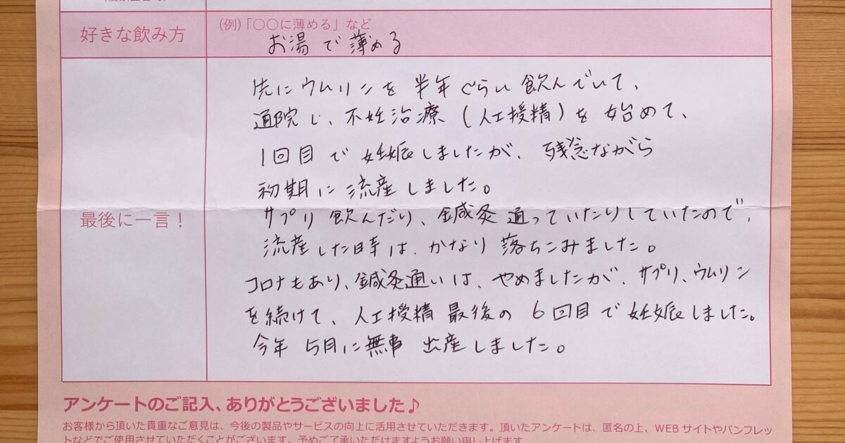 コロナもあり、鍼灸通いは、やめましたが、サプリ、ウムリンを続けて、 今年5月に無事出産しました。