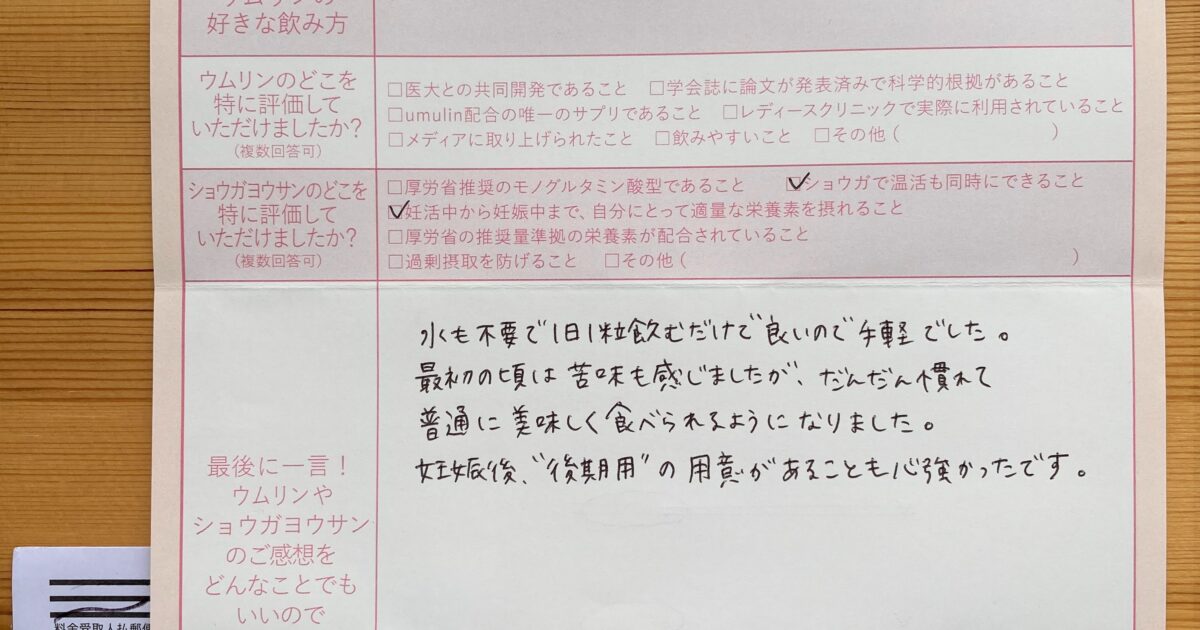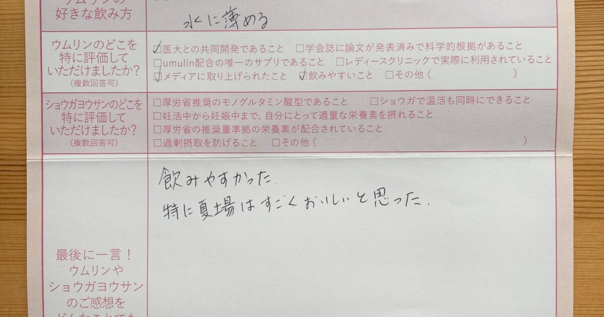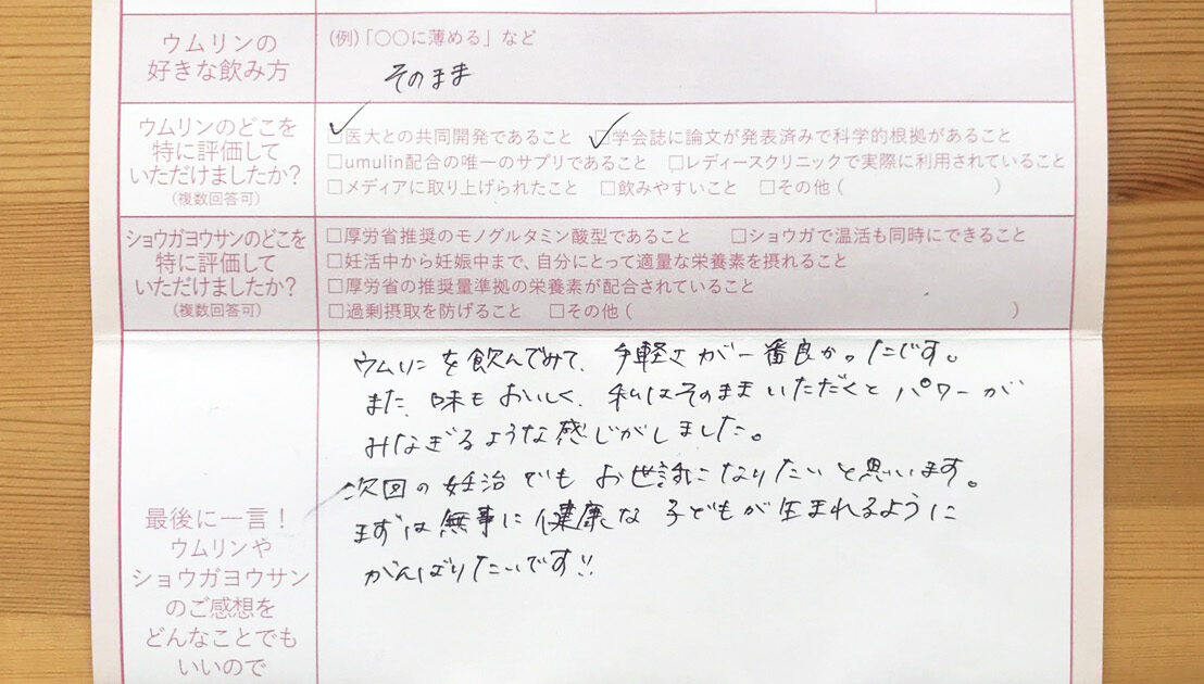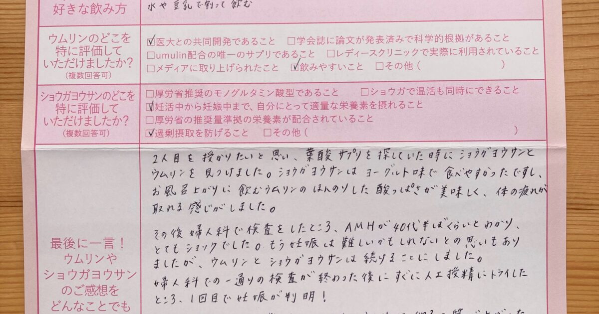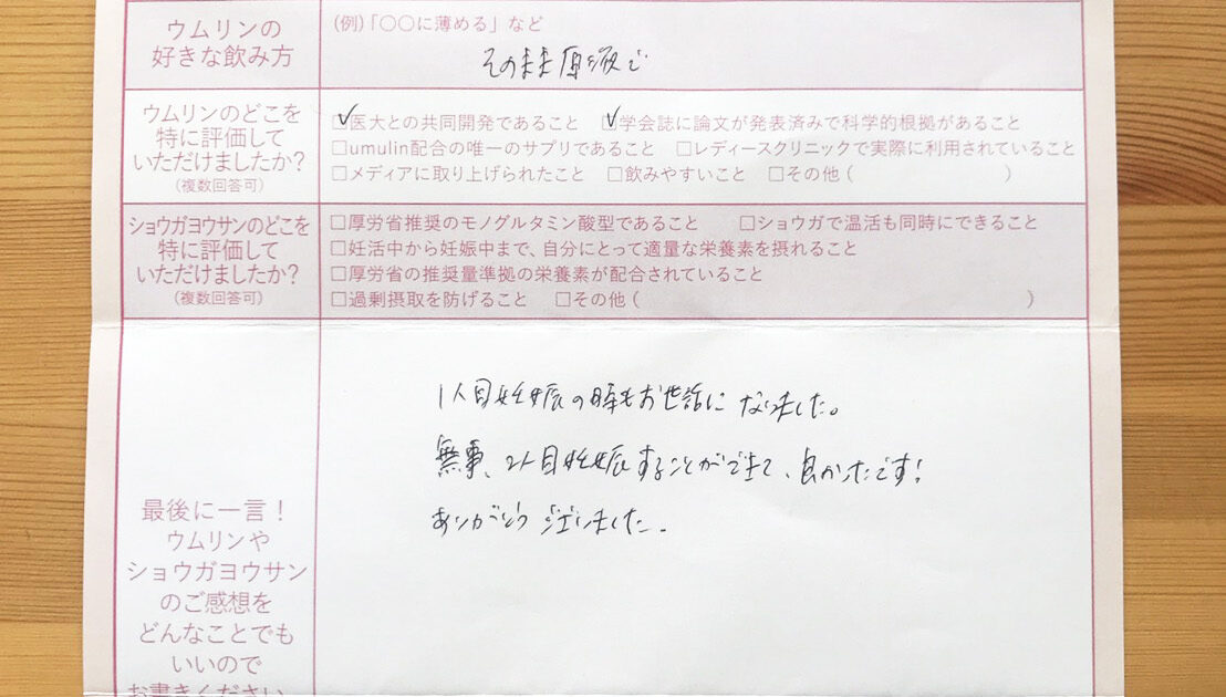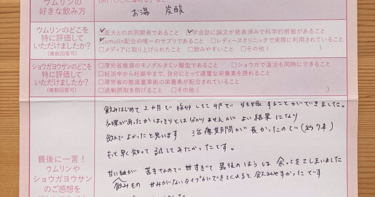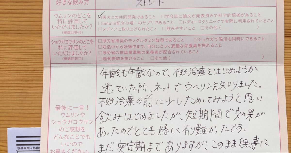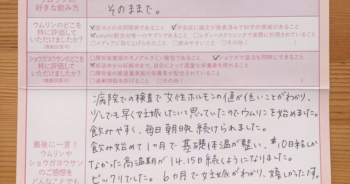飲みやすく、毎日朝晩続けられました。 今はまだ妊娠初期で不安もありますが、無事出産できるよう過ごしていきたいです。ウムリン・ショウガヨウサンに感謝です!